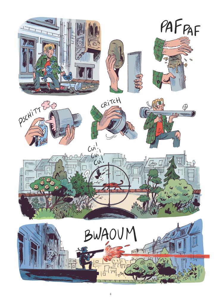 La fleur au bazooka (en réalité, des pâquerettes au lance-patates), perchée sur sa plante, Yasmina nous fait nous demander où elle s’arrêtera. Et qu’on ne s’y trompe pas, pour son troisième tome – et un hors-série qui a commencé cette belle histoire -, Wauter Mannaert ne fait pas un remake parmi les buildings de Jack et le haricot magique mais rêve un autre monde moderne, qui ne reviendra pas sur le béton déjà déployé mais fera une part plus belle à la faune et à la flore. Chaque chose à sa place et en paix.