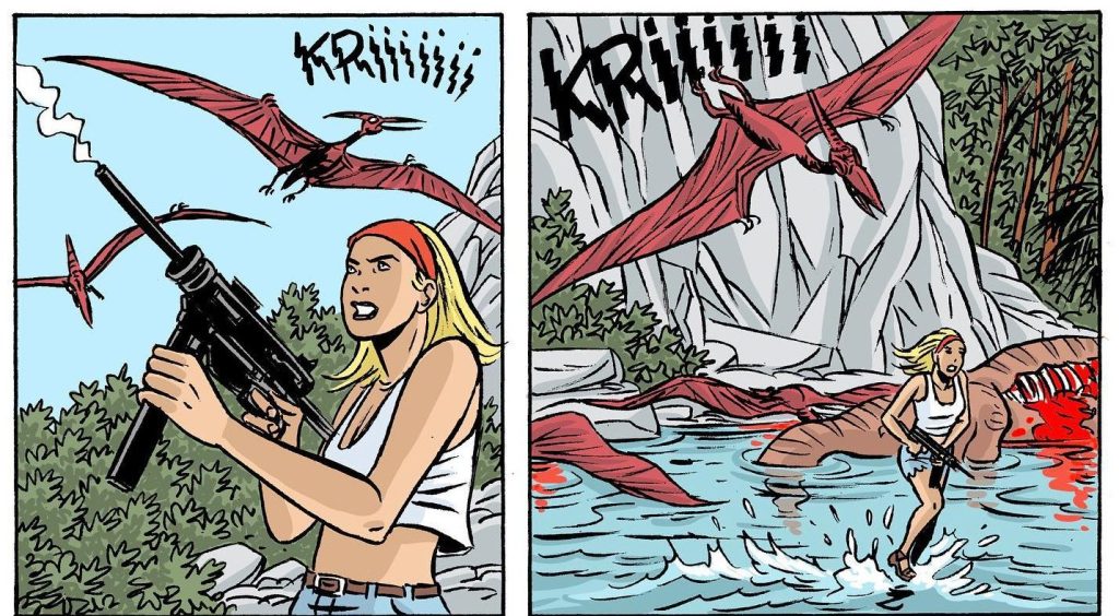 Nous étions partis hippies, et puis… Au fur et à mesure que l’aventure inattendue se déroule, il y a de plus en plus de monde, incasable et insortable, dans cette BD. Jugez un peu: des dinosaures, un fugitif, un avion écrasé, des Indiens, des jumeaux chasseurs de primes, des Russes pas sympathiques et une méchante aussi sexy que machiavélique, carrément badass et rutilante, un relent de nazisme, une colonie de crânes, des vastes étendues et des grottes qui fichent le cafard. Et forcément quelques morts, en dommages collatéraux des diverses quêtes qui s’opposent ou s’allient ici. Flower power contre racisme exacerbé, par exemple. Peace contre war. Sacré cocktail, hein!