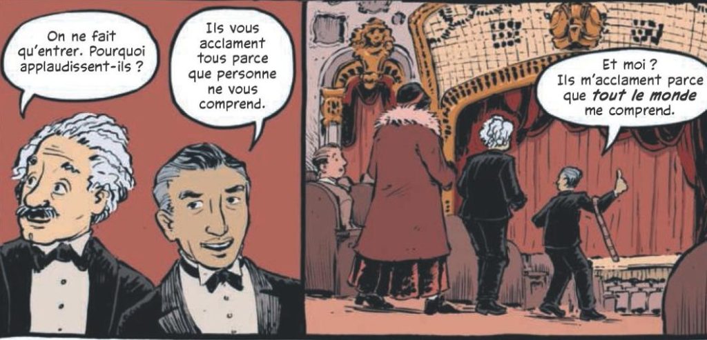 Pour ce qui est de l’histoire, Jim Ottaviani, ancien ingénieur dans le nucléaire, colle parfaitement à la biographie de Einstein mais en y ajoutant « ce qui ne s’est jamais dit », de ses doutes, de ses relations amoureuses ou à ses pairs. On se rend compte également que, durant sa vie, son cerveau extraordinaire ne lui a pas apporté que la gloire. Son effervescence émotionnelle ne lui a pas permis autant de découvertes sur les relations humaines que sur les lois de la physique. On peut aussi remarquer, dans le scénario, que ce n’est pas une simple suite d’anecdotes mais que certaines de ses découvertes sont bien détaillées et que cela permet de casser un peu le rythme de la lecture.