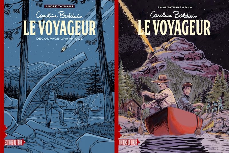 « En 2010, André Taymans écrit le scénario d’un préquel à sa série Caroline Baldwin, intitulé Portage. Pour marquer la différence avec la série mère, il envisage de réaliser l’album en couleurs directes. Il faudra attendre plus de dix ans pour que ce projet, rebaptisé Le voyageur, aboutisse enfin. Pour ce faire, l’auteur s’est adjoint les services de Nico, dessinateur de la série Adelin & Irina, pour la partie graphique. Celui-ci a pu s’appuyer sur un découpage graphique extrêmement poussé, élaboré par le père de Caroline Baldwin. Un tirage limité reprenant ce découpage graphique est également disponible. », c’est ainsi que les Éditions du Tiroir nous présentaient ce projet lors de leur habituelle campagne de financement participatif.