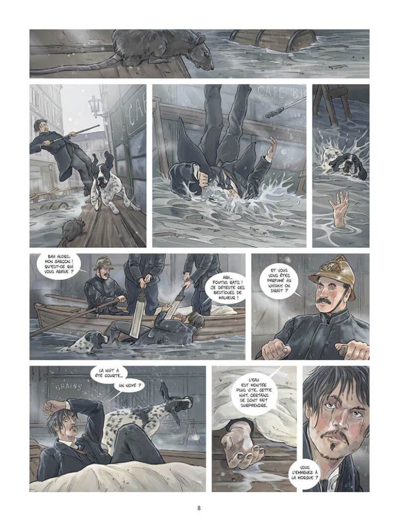 La mise en image de Victor Lepointe est impressionnante, spectaculaire dans ces fragments de décadence d’une Belle époque, entre misère un peu plus frigorifique depuis que l’eau s’y infiltre et grand luxe. La manière dont se déplacent Ange et son chien est funambule, les mouvements, les postures rendent vraiment cet album vivant alors qu’il se réglera, si ce n’est quelques cauchemars (parfois superflus et grossiers), par la papote. Il n’y aura pas de course-poursuite. La lumière, les couleurs trouvées pour vieillir le dessin et bien le placer dans son époque sans le rendre désuet, c’est un travail d’orfèvre.