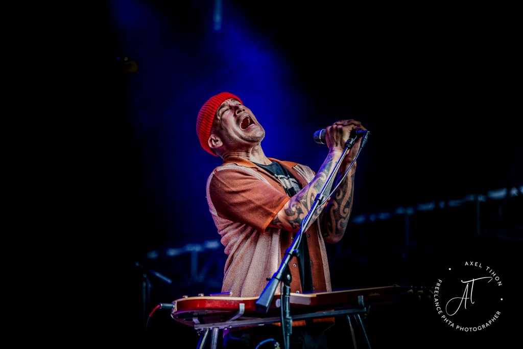 En fin de soirée, pour notre équipe, c’était le moment tant attendu pour cette date unique du samedi 8 juin 2023 en Belgique pour Ben Harper avec son groupe « The Innocent Criminals« . Beaucoup de monde était venu spécialement pour l’occasion et ce joli moment de reggae-blues, folk au son californien. Nous avons pu apprécier le style musical de ce grand bonhomme avec ses guitares Lap-Steel, son jeu au bottleneck , hérité des bluesmen du Mississippi ainsi que sa voix chaude qui ont imposé son style .