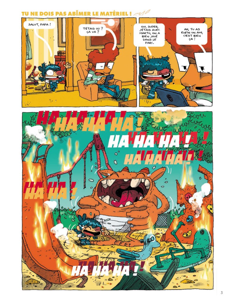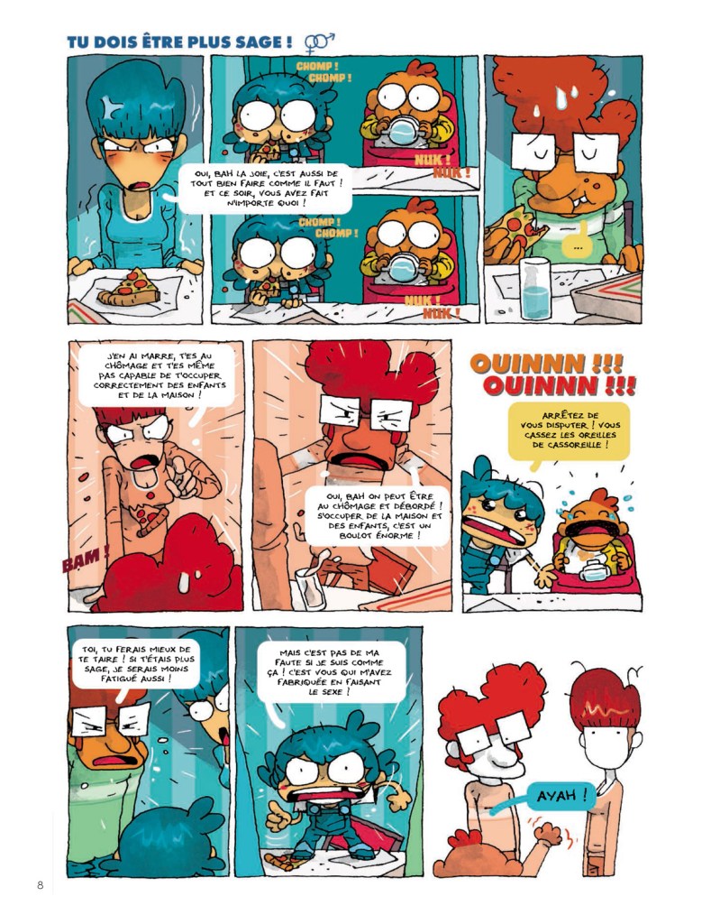 On prend les mêmes et on recommence, donc, de manière encore un peu plus décapante. Et ce n’est pas pour nous déplaire. Si vous voulez quelque chose de sage pour les enfants, vous n’êtes pas au bon endroit ici, c’est exubérant et c’est peut-être mieux pour cerner le monde, ses défaillances et ses excès. Pour Billie, ça commence face à un père qui fait ce qu’il peut, qui démissionne quand il est hypnotisé par son smartphone et qui s’emballe quand il doit faire preuve d’un peu d’autorité, pour les devoirs par exemple. Mais Billie, peu importe les émotions de ses proches ou de la galerie de personnages qu’elle peut rencontrer (psychologue, pompiers, policiers), a toujours la pièce à mettre au trou… pour décontenancer les adultes, bouche bée, et faire marrer, hilarer même (on s’en fout si ce n’est pas du français correct, Billie se bat bien contre les « machants »), le lecteur.