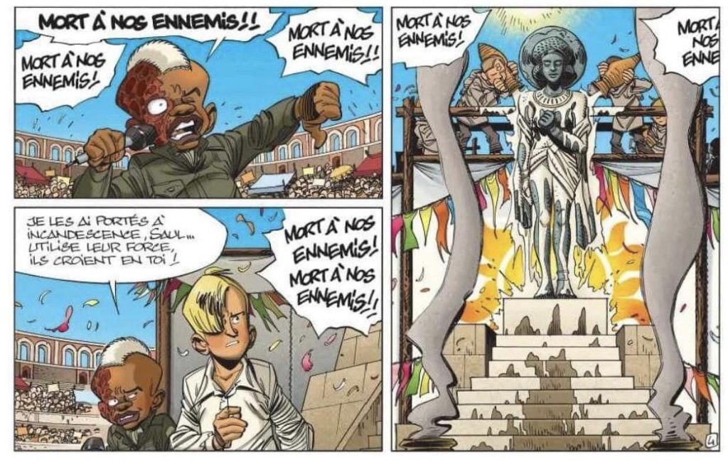 Et, j’avoue, peut-être suis-je un peu lassé par cette mécanique, cette fuite inlassable. D’autant que la Protectrice, obstinée et monstrueuse, m’a semblé un peu pataude dans certaines planches, peu charismatique. Trop anecdotique que pour être la menace d’un album entier malgré des scènes d’action qui secoue? Cela dit, il y a une astuce, comme dans les jeux vidéo, si Dodji, Leila et les autres sont déjà morts, ce n’est pas pour autant qu’ils ne peuvent pas remourir, une fois arrivés au bout de leur nombre de vies limité.