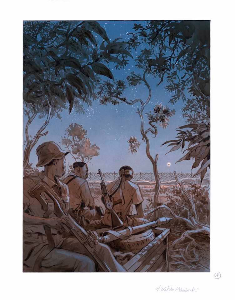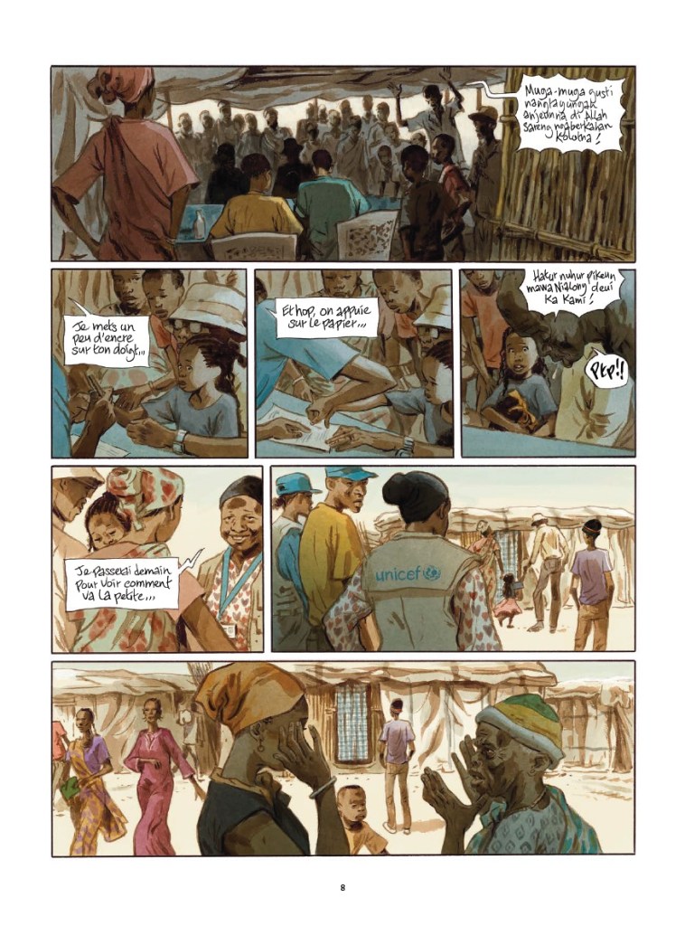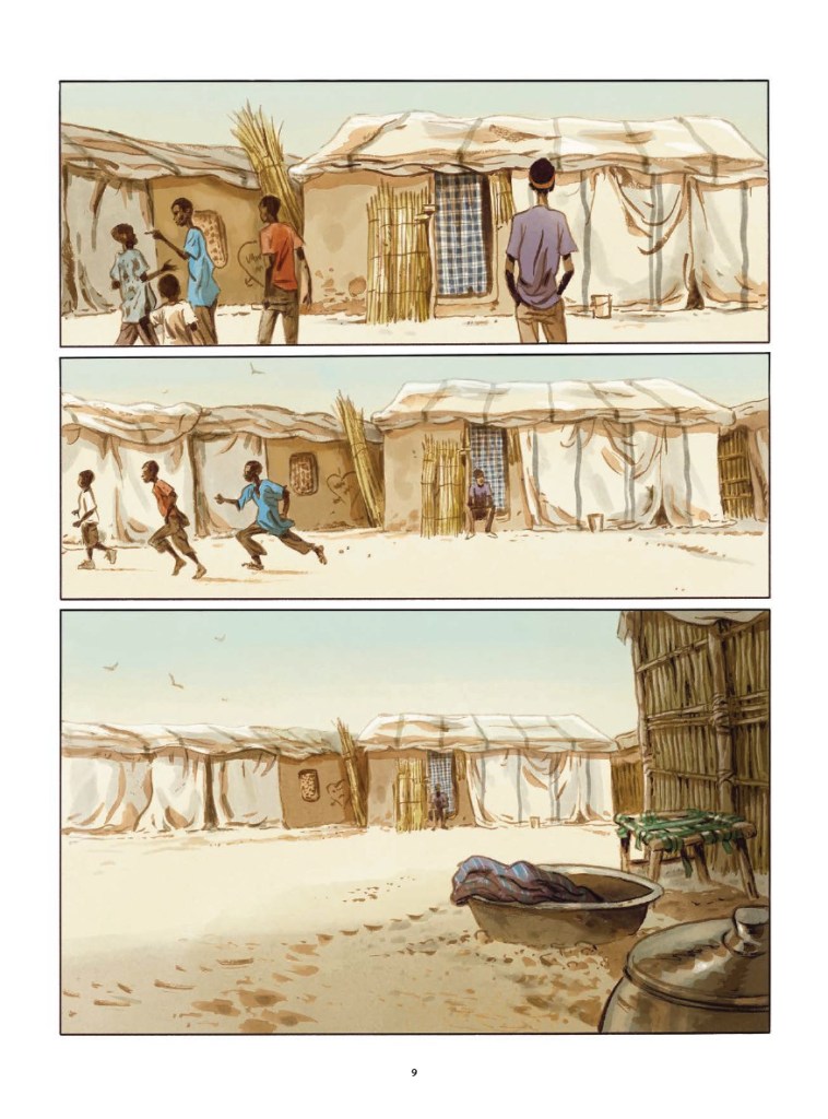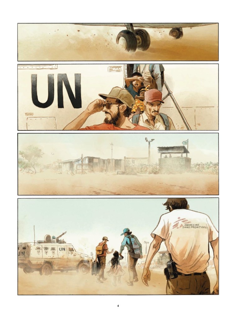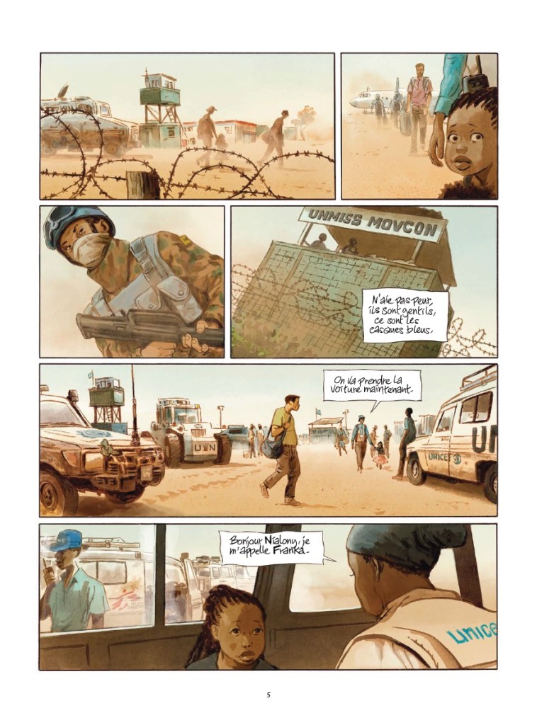 J’avais dans l’idée de faire un album en rentrant du séjour à Bentiu mais je n’arrivais pas à trouver le moyen de raconter ce conflit et tous ces gens déplacés dans la savane…Le déclic a été donné par un ami, Jérome D’Aviau, qui m’a demandé d’écrire une histoire pour que l’on fasse un court métrage animé ensemble…J’ai pensé aux enfants que j’avais rencontrés là-bas, Georges et Nialony, et j’ai commencé à écrire et à me dire qu’il y avait matière à faire un album de BD. J’ai repris les photos que j’avais d’eux et je m’en suis inspiré pour mes personnages principaux. Ils avaient aussi une histoire et j’ai pensé que mêler réalité et fiction était le meilleur moyen pour évoquer ce conflit, de rapprocher cette population de nous et de les rendre visibles.