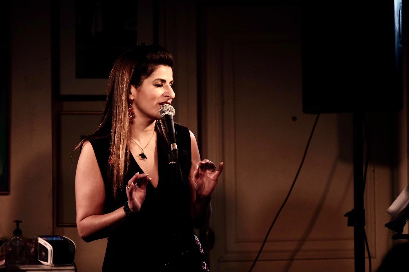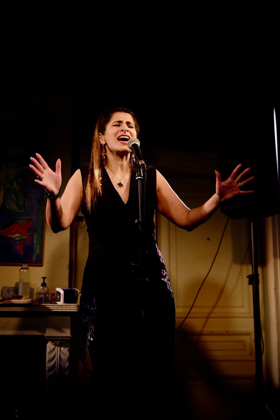 Ce soir le spectacle met à l’honneur deux grandes dames de la chanson française, Piaf et Barbara. Deux dames en noir qui ont perpétué comme Juliette Greco la tradition de la robe noire sur scène lancée par la grande et trop méconnue Damia sur une idée de Max Dearly. Damia chantait sans micro, robe noire, rideau noir, dans un esthétisme scénique qui s’inscrivait dans l’expressionnisme et une certaine forme de rénovation dramatique.
