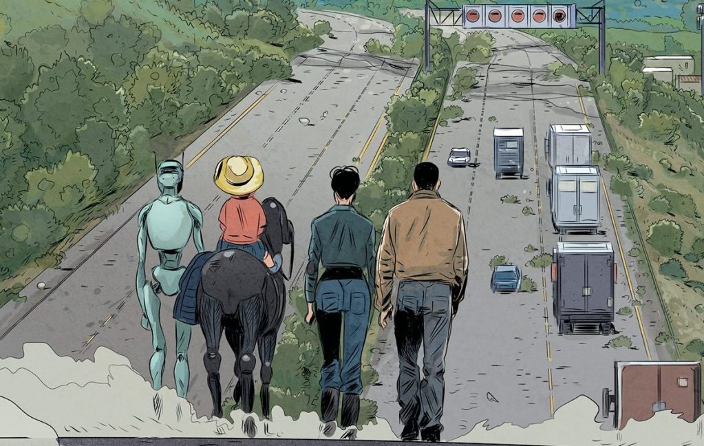 Malgré une ou deux séquences clichées, on se laisse embarquer dans cette grande aventure de 110 planches (dont on verrait bien une suite) palpitante et riche en rebondissements inattendus. Seule contre tous, y compris ceux dont on ne penserait absolument pas à se méfier, l’équipée hybride de nos héros complexes est propulsée par le dessin tout terrain et spectaculaire de Francesco Trifogli. J’ai beaucoup aimé son bestiaire robotique, sa manière d’amener les scènes d’action, très dynamiques, pendant que Yann Bécu fait son laboratoire en testant les aptitudes de ses protagonistes, leur résistance, leur résilience, leurs pulsions de survie et autres. Avec une très bonne idée de départ, les auteurs tiennent le coup de bout en bout et nous laissent sur une fin ouverte, avec matière à réfléchir. Tout en donnant envie, quand on aura un peu oublié les éléments de l’intrigue de la BD, de lire le roman.