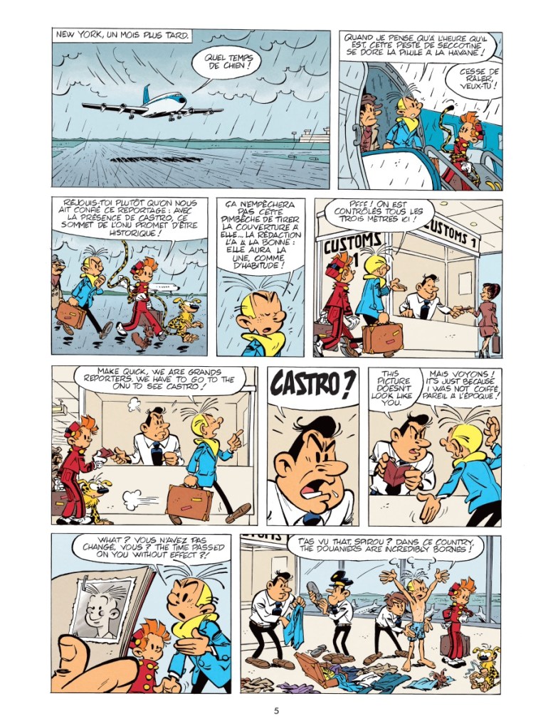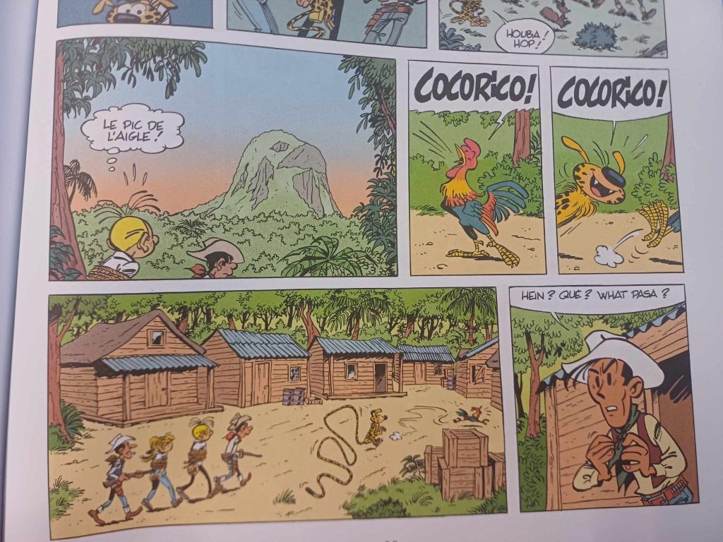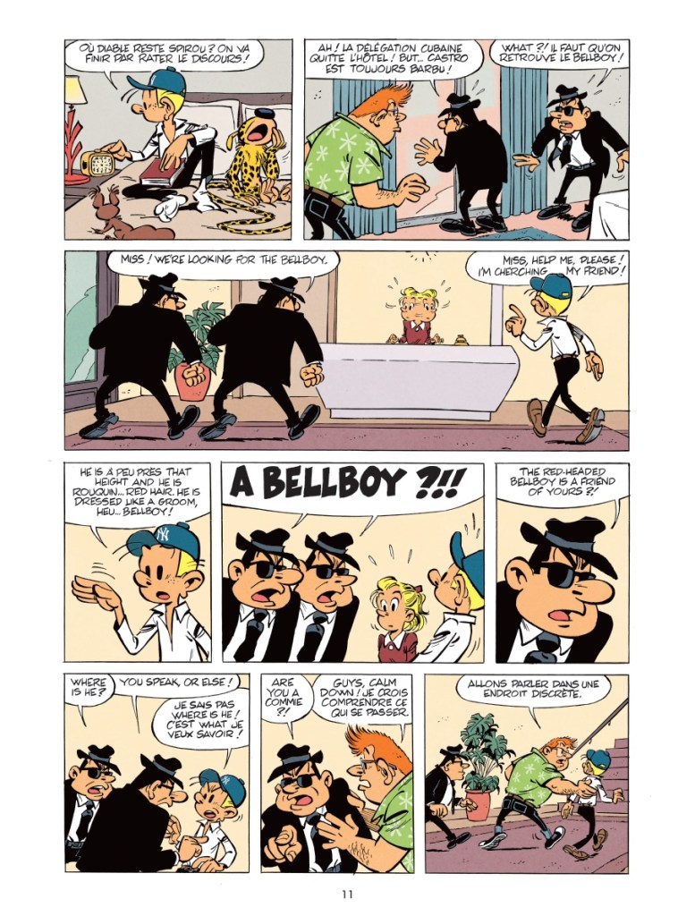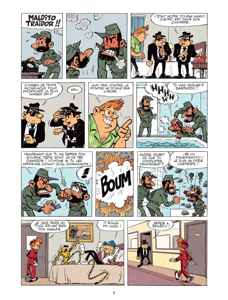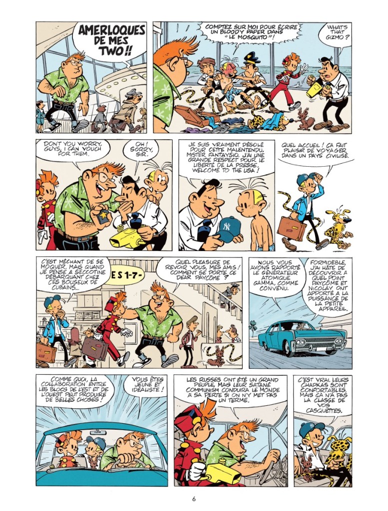 Déjà, le lecteur part un peu perdu, et les auteurs le semblent aussi. Et ce n’est pas fini. De gag à plat en gag à plat (même si on sous-emploie le rebondissant Marsupilami), on dirait que cette aventure sait qu’elle court à sa perte et ne vaut pas la chandelle allumée dans les yeux des afficionados du Spirou des premières heures. Alors, elle perd du temps. Ça blablate, ça blablate, oui mais en Espagnol, oui mais en Anglais, ou en espagnolisant le franchais. Quitte à ne plus rien comprendre à ce charabia – on demande la VOST -, encore moins quand, tout d’un coup, un peu plus loin, tous les personnages semblent enfin parler la même langue. Rien n’a de sens, et c’est surtout lourdingue.