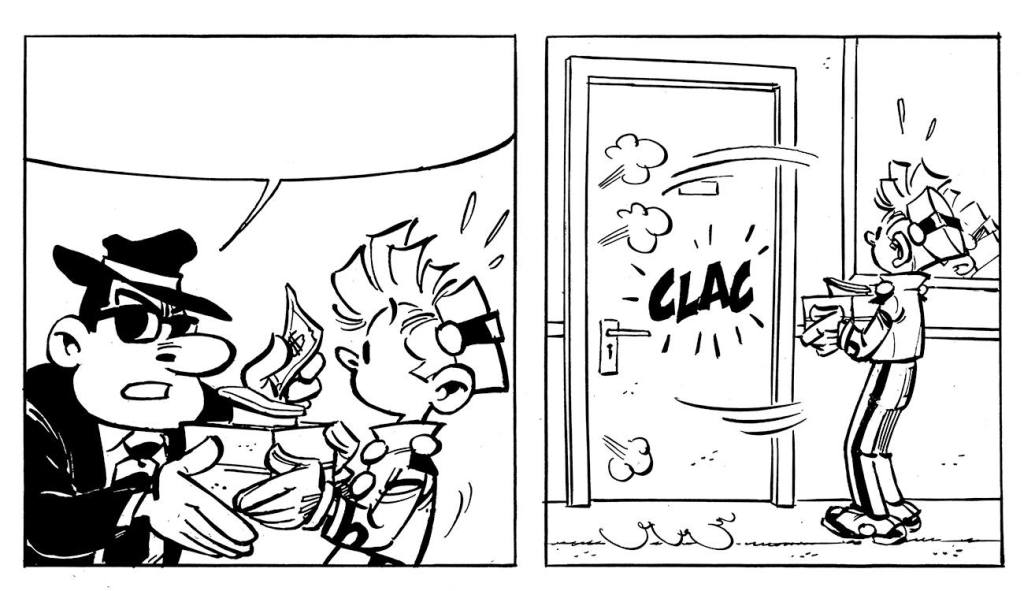 Voilà, après Tarrin, dans une moindre mesure qui laissait tout de même parler sa particularité (comme dans les Astérix qu’il réalise), qu’Elric se force ou est forcé à faire du Franquin, sans s’en tirer aussi bien. Oh, il ne se débrouille pas trop mal, mais quand on compare avec le maître qu’Elric doit faire un peu plus que recopier, jamais il n’y a l’étincelle. N’en déplaise aux gardiens du temple qui attendent ce moment depuis cinquante-cinq ans (et ne se retiennent jamais de massacrer sur la place publique le travail de ceux qui tentent de nouvelles choses avec les personnages iconiques), ça ne tient pas la route. Encore moins 62 planches d’un album complètement vide et empilant les clichés. Voire les plagiats.
