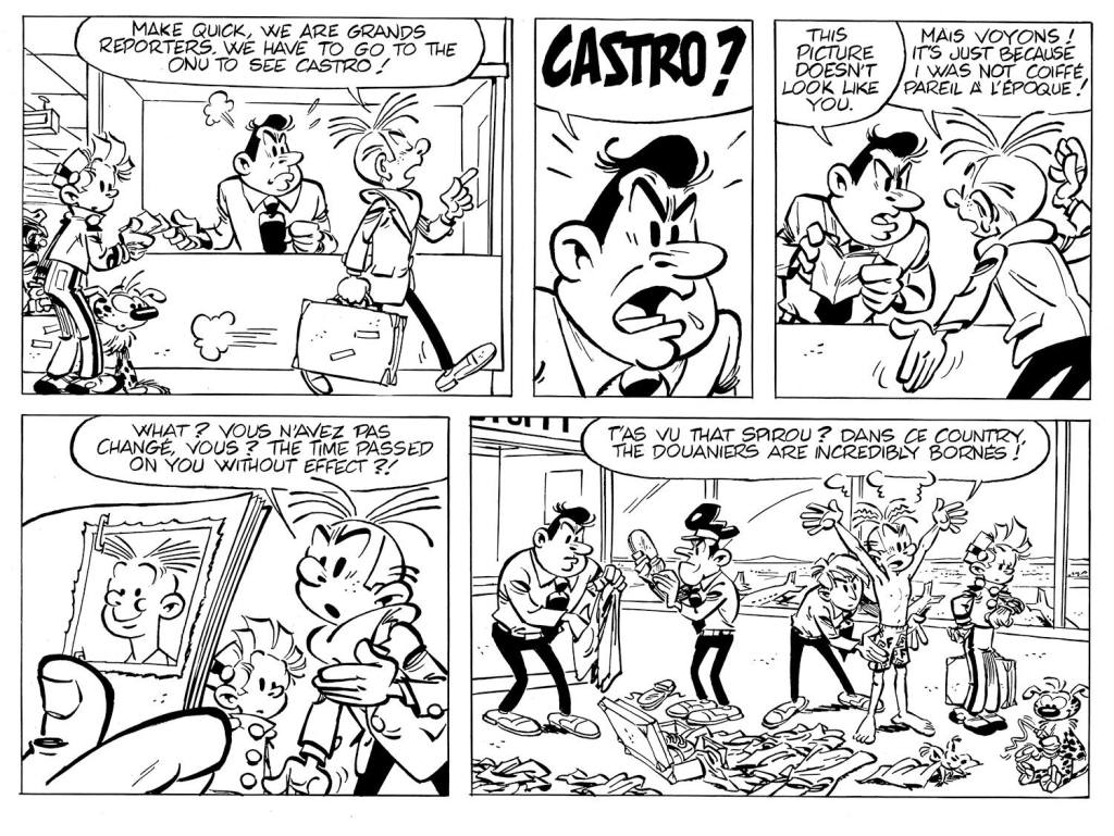 Changement total de latitude et de longitude. Après la Russie enneigée, retour sous des températures plus clémentes, d’autant plus que les esprits s’échauffent, à Cuba, pour Spirou et Fantasio. Qui ? Pas le Spirou et Fantasio de la série originelle, ni de la collection « vu par » (encore que cette nouvelle anthologie parallèle pourrait très bien être un spin-off du spin-off), mais ceux des « classiques ». Soit ce que l’éditeur Dupuis identifie comme l’âge d’or. Celui de Franquin qui, après Rob-Vel et Jijé, inventa la mythologie et la bible du groom le plus célèbre du Neuvième Art. Avec ses amis, son bestiaire (le Marsu!), ses gadgets, son phrasé, sa dynamique. Puis, l’esthétique d’une maquette, pas de dos rond mais bleu avec son lettrage vertical et une quatrième de couverture grise. Le vintage à fond, dont on accommode les (excellents) restes soixante ans plus tard.
