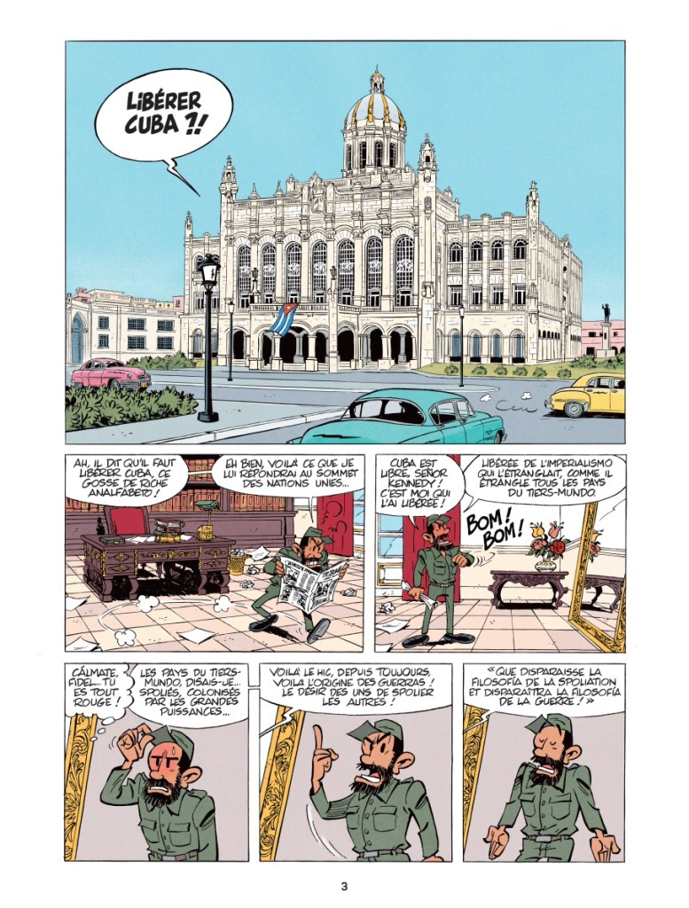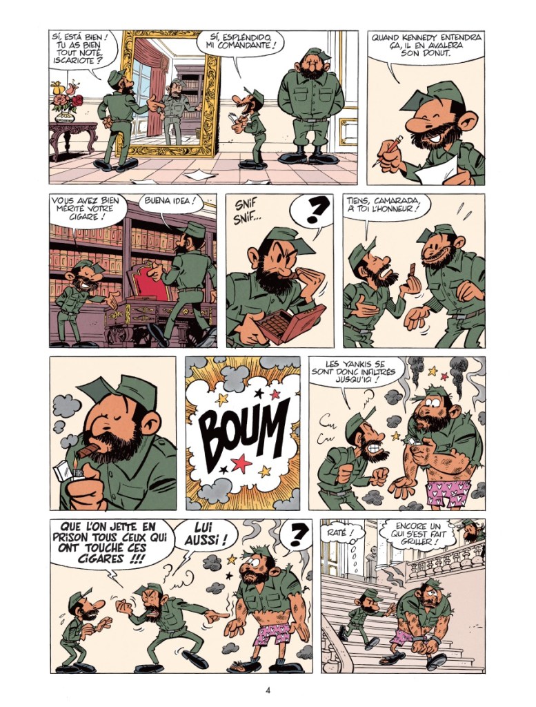 Bon, on a parlé de ces bons vieux Longplaying et Marsupilami (ah oui, tiens, il y a Spip, en planche 20, qui se « demande quand il allait servir à quelque chose dans cette aventure », aveu d’oubli des scénaristes obligé au fourre-tout?) mais quid des autres personnages? Alors, il y a Fidel Castro et Che Guevara, plutôt bien campé dans leur idéalisme, leur grandiloquence et leur furie, puis Kennedy et, dans le reste de la galerie… on croise un Lucky Luke, une descendante de Bonnemine aux cheveux noirs, des ersatz d’Abdallah et des Dupondt. Ce n’est pas qu’ils sont cités, qu’on leur rend hommage, c’est qu’on les utilise facilement. Hop, un personnage gratuit et qui fonctionne. Tout le monde, il est là, tout le monde y fait pitié dans une histoire amenée au forceps, absolument pas passionnante, éculée, épuisante, déprimante et énervante.