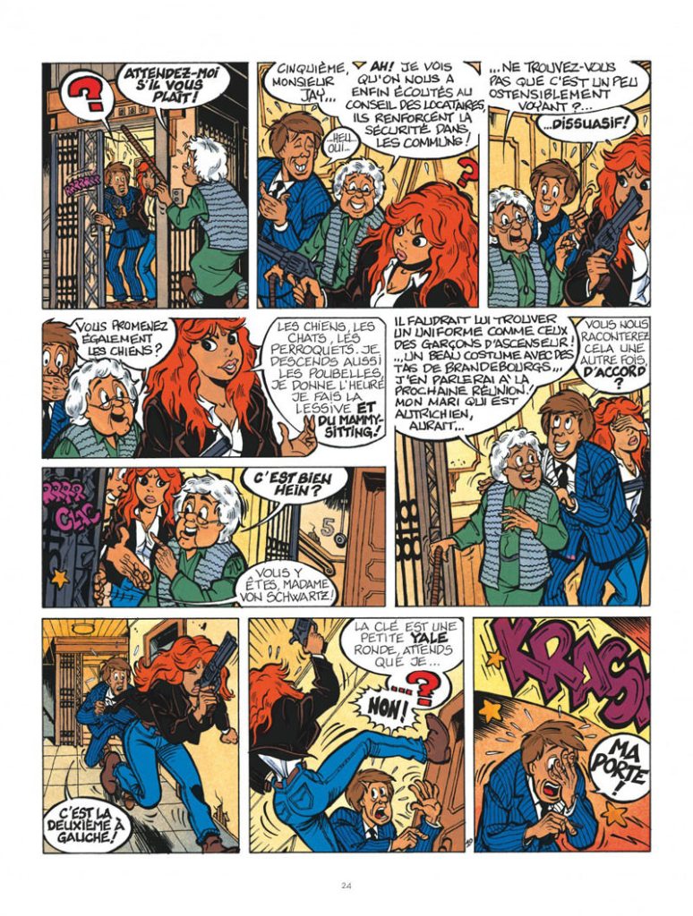 Nico : L’humour des dialogues, ça vient de Mythic ; l’humour dans les dessins, c’est de moi. Pour ce qui est du taser, j’ai essayé plusieurs solutions pour tenter de rendre ça le plus expressif possible. Il fallait que ça bouge, et je n’avais aucune référence graphique pour m’en inspirer. Il a donc fallu que j’invente quelque chose. On voit ça plutôt dans les dessins animés de Tom & Jerry ou Titi et Grosminet. Je pense que tout peut être traité avec humour. Je me suis beaucoup amusé à dessiner le personnage de Lilith, la gamine diabolique. Dans ma première version, je lui avais donné les traits de François Walthéry. Puis j’ai changé d’avis. Il y a une case où je lui ai mis entre les mains une corde avec sa peluche pendue au bout par un nœud coulant. Pour moi, ça ajoute du plaisir de relecture.