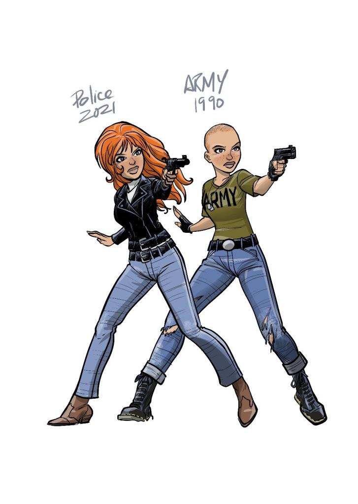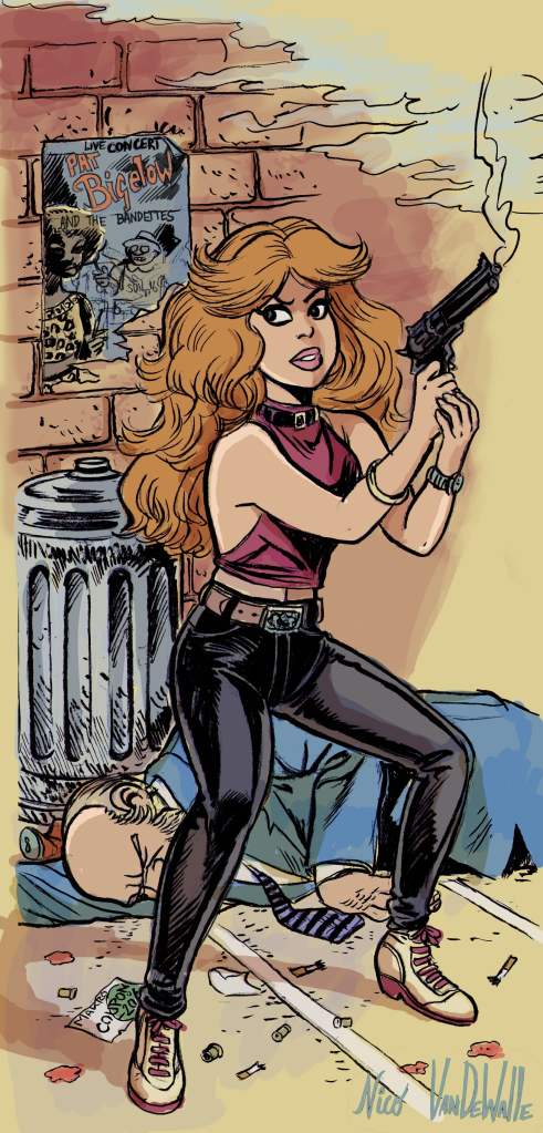 Si dans une première mouture, j’aurais souhaité voir officier Rubine à la Nouvelle-Orléans, ville cosmopolite et surtout bigarrée, j’ai eu peur de noyer le personnage dans un univers trop francophile. Je lui choisis donc une ville du Nord et préférai Chicago à New York car, à l’époque, les films polars se déroulaient quasi tous à New York… Ce qui est loin d’être encore le cas aujourd’hui. L’habit du personnage se complèterait au fil des récits. Je fournis aussi, quelques cassettes de la série Lady Blue (1985) et celle du film Blue Steel (1990) pour poser le personnage …
