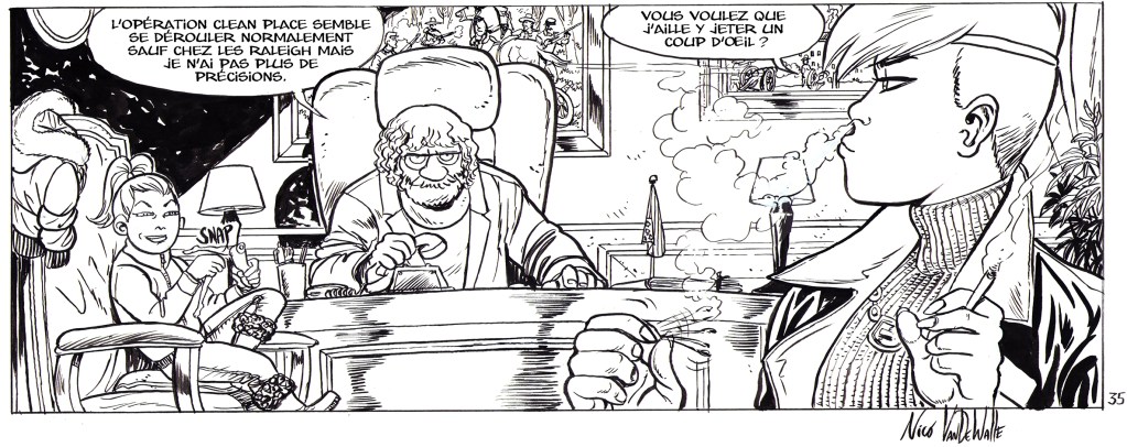 Nico : En tout cas, c’était enrichissant de travailler avec un scénariste comme lui, qui a une belle et longue carrière derrière lui. Avec lui et avec André Taymans, j’ai pu voir d’autres manières de concevoir une planche de BD, toutes deux très différentes de mon approche habituelle.