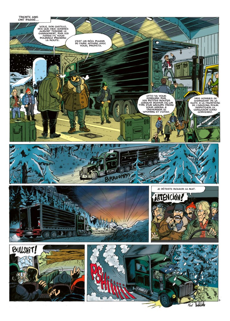 Mythic : Non. J’essaie d’expliquer, le mieux que faire se peut, chaque plan (une sorte de mise en scène pour dessinateur fatigué) mais le dessinateur est libre de jouer avec les images comme il l’entend. Avec l’arrivée d’Internet, je truffe le scénario de documents, de films et de photos pour faciliter le travail graphique.
