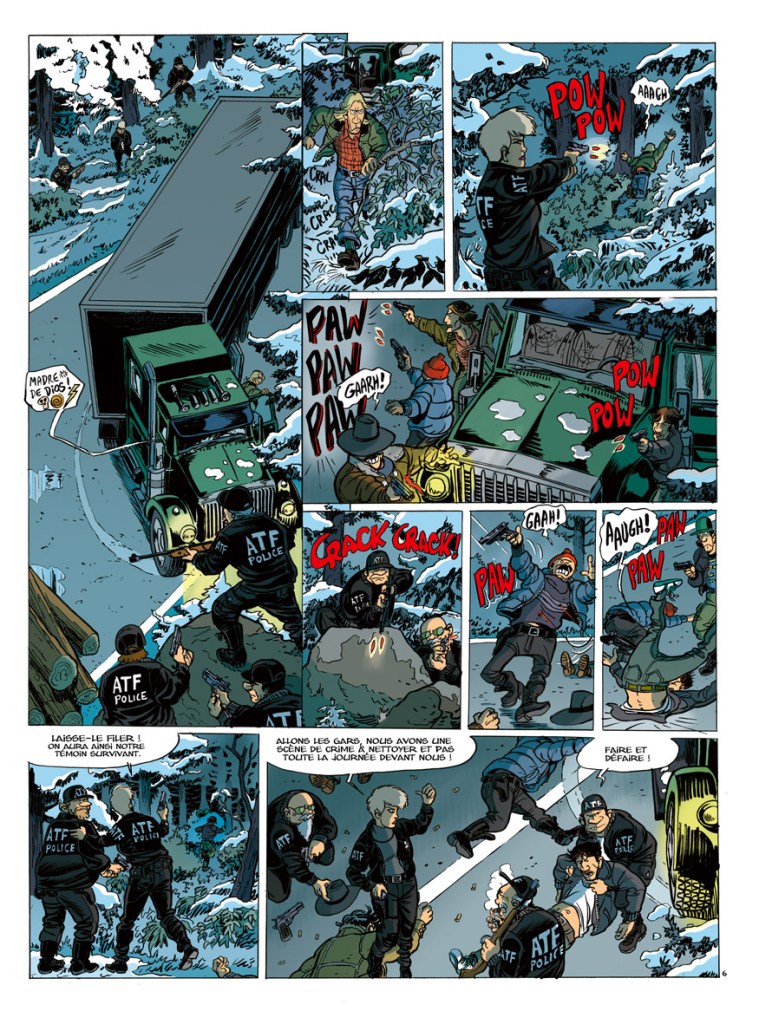 Nico : Avant de commencer à dessiner l’album, j’ai revu Rambo I, pour me mettre dans l’ambiance. Il y a aussi À couteaux tirés avec Alec Baldwin et Anthony Hopkins, ou Le contrat avec Morgan Freeman.