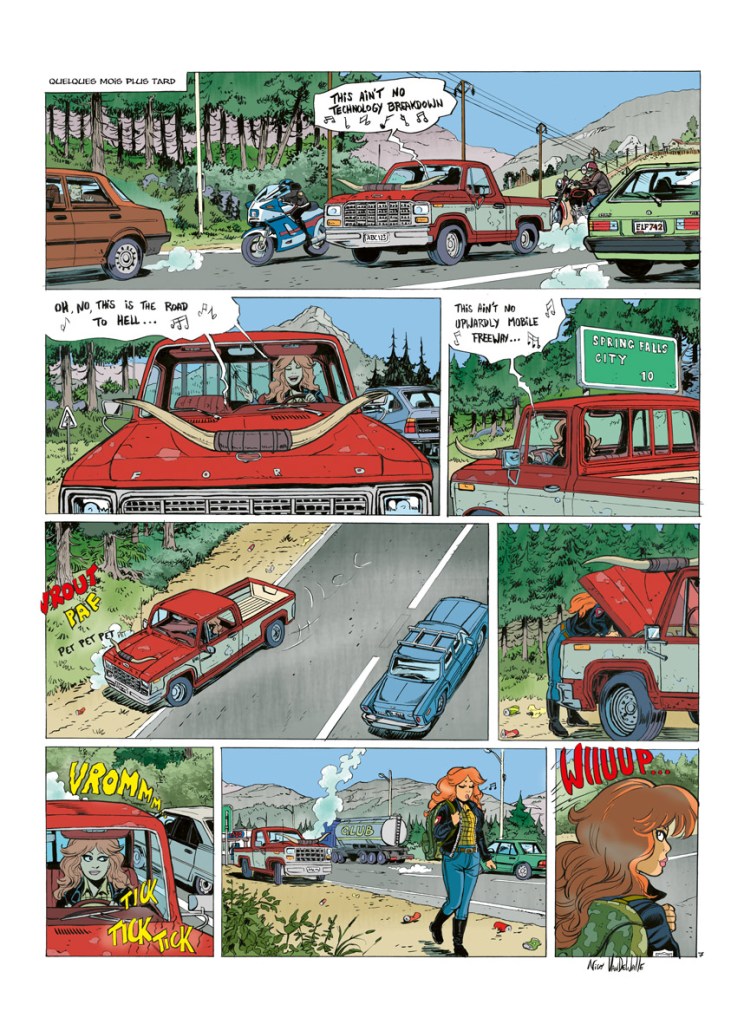 Nico : C’est sûr que dessiner des ordinateurs, c’est ce qu’il y a de plus barbant à faire. J’ai horreur de ça, donc ça m’arrange aussi. Mais j’aime les défis graphiques, et je détesterais faire tout le temps les mêmes albums. J’aime que mes albums soient tous différents les uns des autres. Ici, j’ai pu faire des tas de trucs que je n’avais jamais faits.