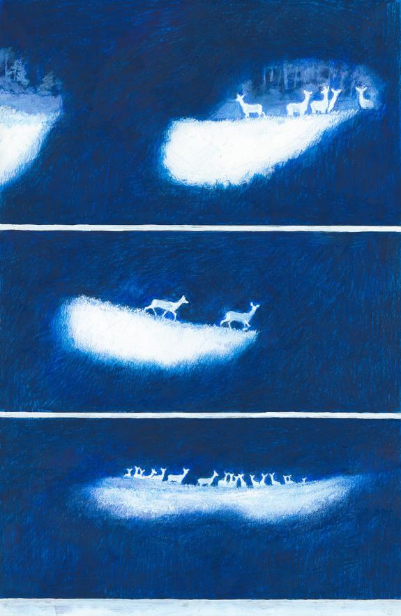 Ma méthode procède plus de la peinture que du dessin, où les surfaces de lumière et d’ombre font émerger l’image. La ligne, elle, intervient à la fin pour préciser les formes. Mais je laisse aussi apparaitre les repentirs pour ne pas coincer les formes. Il y a de l’acrylique, de la craie, du crayon de couleur tout cela se construit successivement par couches (sur un format de 50 cm de hauteur) dans le silence ou la musique.