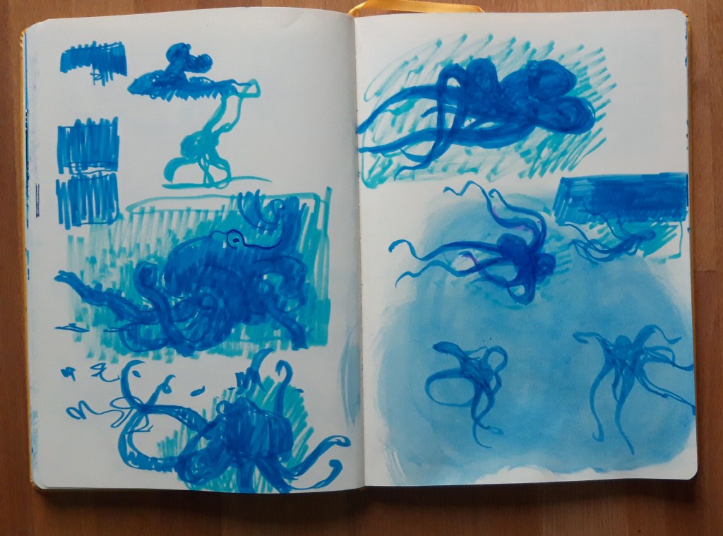 Mon inspiration pour cet album est née aussi de lectures scientifiques et de documentaires scientifiques. Je pense aux documentaires du commandant Cousteau et de Jean Painlevé, pour les plus anciens. Question lecture il y a l’essai de Peter Godfrey-Smith sur l’intelligence des poulpes (cf Le prince des profondeurs…) qui a été prépondérant. Mes sources bibliographiques sont citées à la fin de l’album.