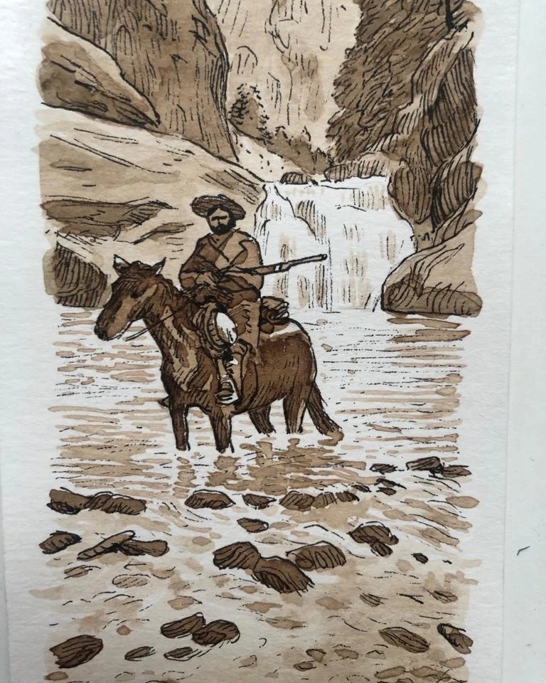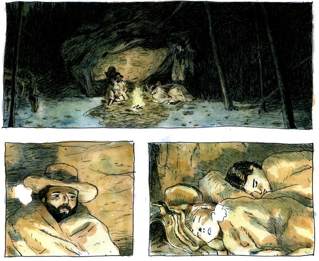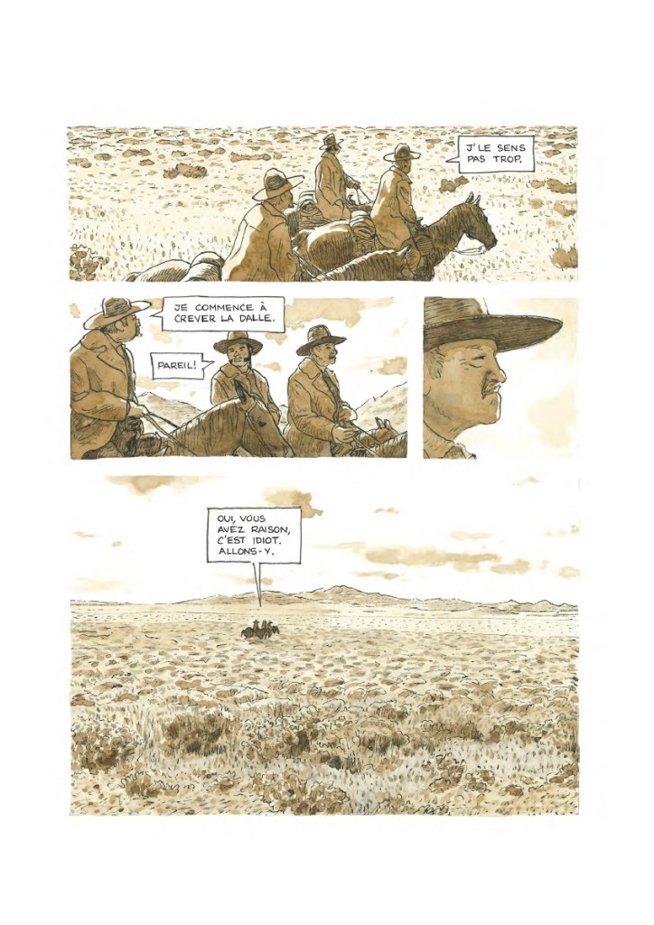 Sept mois plus tard, le décor a changé, la poussière a laissé place à la glace, à la neige. Un linceul sur lequel un père et ses deux enfants marchent sans fin. Eux suivent, lui ne baisse pas les armes, il poursuit cette quête insensée d’arrêter les criminels qui ont tué l’amour de sa vie. Car c’est ce qu’il s’est passé, en toute sobriété, dans l’ellipse. Des faits que le sépia ramènera au fil du récit mais qui continuent de tourner tout le temps dans la tête de M. Hatton. Il n’a pas de prénom, du moins le lecteur ne le connaîtra pas, son visage buriné est passe-partout, ça pourrait être vous ou moi. Il n’est pas tranquille, il se repasse le film maudit, horrifiant, insupportable, tellement injuste. Elle était sa raison d’être, tuer les agresseurs sera sa raison de vivre, avant peut-être de pouvoir passer à autre chose. Et ses enfants qui suivent, qui ne sont pas encore en âge de tout à fait comprendre, mais n’ont plus que lui.