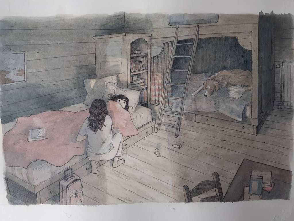 Si le scénario tient en un souffle de vent, c’est tout le travail et la dynamique du dessin, de ses magnifiques peintures qui nous saisit et nous emporte. On vit véritablement cette tempête, bouche bée. D’ailleurs, David Wautier a opté pour un récit muet, sans mots, sans paroles. Pourtant, le bruit est bien présent tant le cataclysme, sous le talent de l’illustrateur belge, décuple les sensations. Quand le chien relève la tête, qu’il aboie, que le chariot est soulevé et fracassé, que les murs résistent ou fuitent, que la pluie fait plic-ploc. Sans surenchère aucune, juste avec le sens du détail et du cadrage, David Wautier signe une histoire banale (comme il y en a de plus en plus avec le réchauffement climatique) mais avec une force (et une fragilité) anormale, bouleversante – jusqu’à en avoir les larmes aux yeux -, impressionnante, poétique aussi. Un album dont on ne se lassera pas même s’il réveille des cauchemars, s’il fait frissonner. Mémorable. Bonus: restez bien jusqu’à la fin.