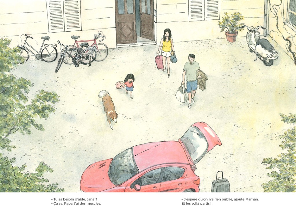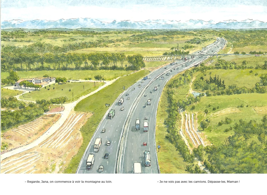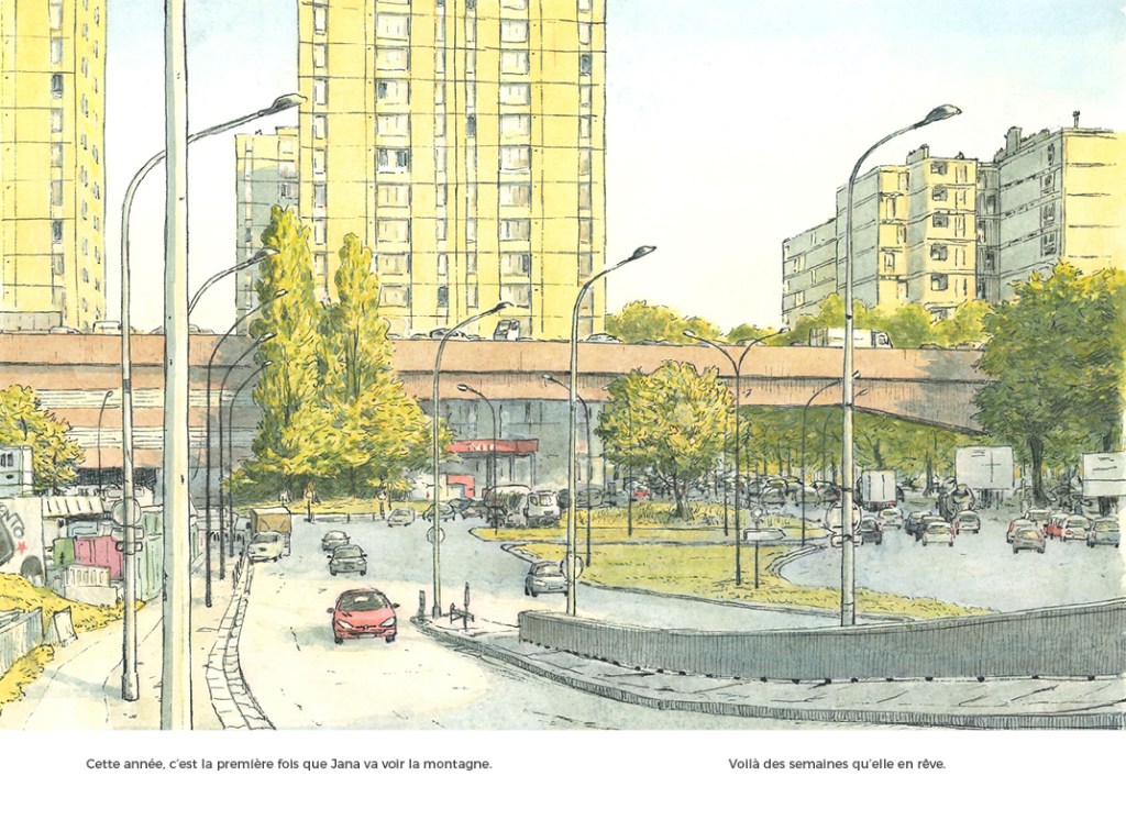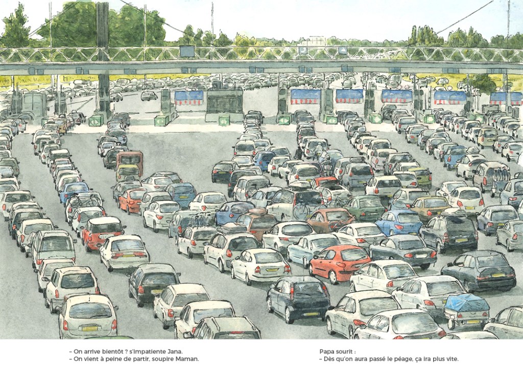 Pourtant, par rapport à ses deux petits-frères, Montre-toi montagne! prend le récit un peu plus tôt et s’intéresse à ce qu’il se passe avant d’arriver au chalet. Ce sont le voyage et le dépaysement à notre époque que visite David Wautier. La famille de Jana part en vacances. C’est la première fois que la petite fille va voir la montagne, elle est surexcitée, s’impatiente, d’autant qu’ils sont loin d’être les seuls à avoir pris la route. Il y a des embouteillages, sur la terre comme au ciel. Ah ces nuages, cette brume.