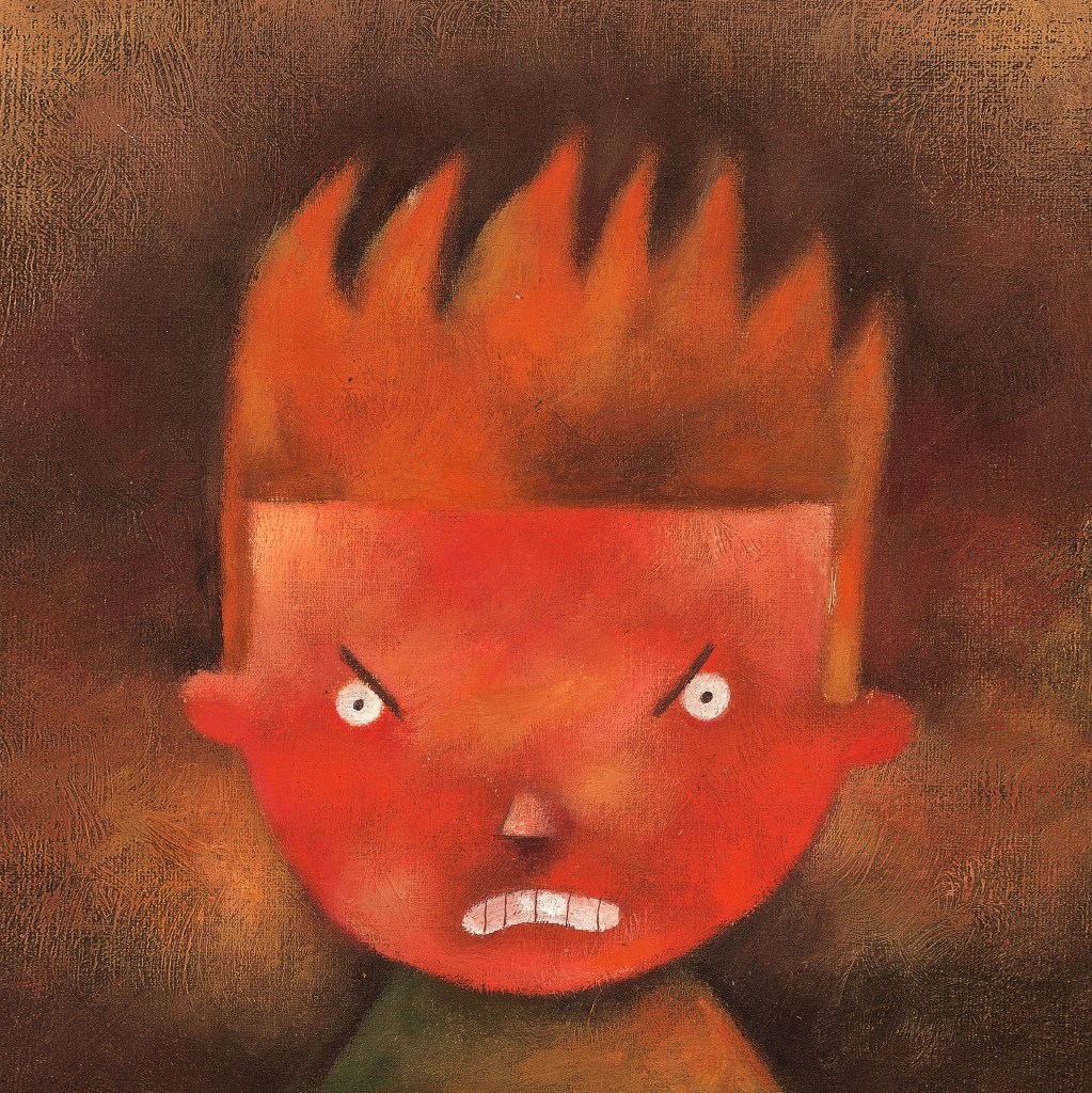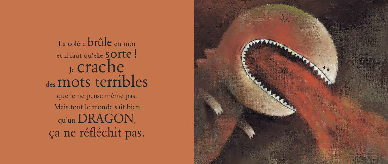 Faisant communier leur tout jeune héros avec ce feu irrépressible, Thierry Robberecht et Philippe Goossens racontaient une métamorphose, en 2003: La colère du Dragon, aujourd’hui réédité chez Mijade. 12 doubles pages cartonnées et rougeoyantes, avec un texte qui sursaute de fureur et des dessins qui se font de plus en plus monstrueux. Car notre héros se transforme en dragon. Sans plus rien contrôler, sans comprendre ce qu’il se passe. Comment il en est arrivé là, le lecteur ne le saura pas, c’est dérisoire. C’est tout le cheminement de l’explosion au retour au calme et à l’amour, au réconfort familiaux, que les auteurs explorent avec l’art et la manière, les images qui claquent et mettent des symboles éloquents sur ce qui traverse l’esprit de nos mômes. Et les images, ça peut apprendre à mettre des mots sur des sensations et sentiments aussi f(l)ous que la colère et la violence qu’elle met en scène.