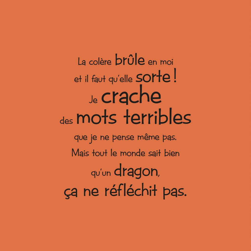 Résumé de La colère du dragon par Mijade : Quand je suis en colère, parfois, je sens comme un feu grandir en moi. Je deviens tout rouge et je me transforme en un horrible dragon gigantesque qui casse tout et qui ne reconnaît plus rien ni personne! Après, je reste assis sur mon gros derrière de dragon au milieu des ruines de ma chambre. Je pleure, et mes larmes éteignent le feu qui brûle en moi. En un rien de temps, je redeviens un petit garçon et maman est là pour me consoler.