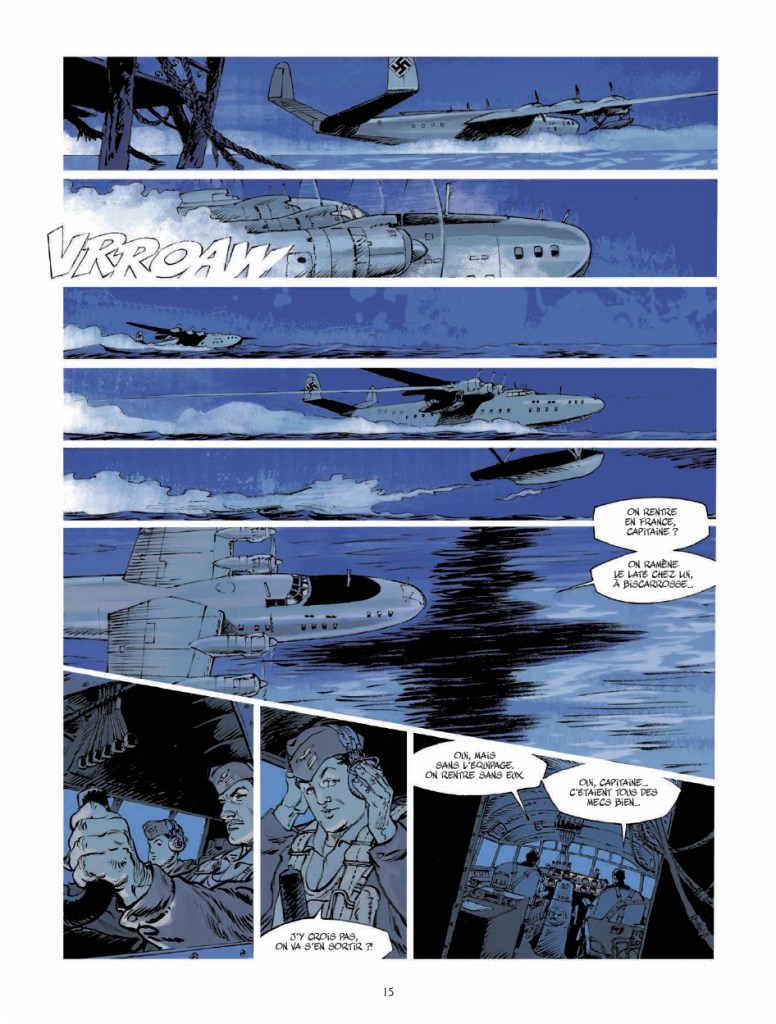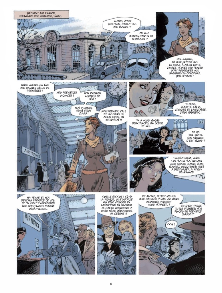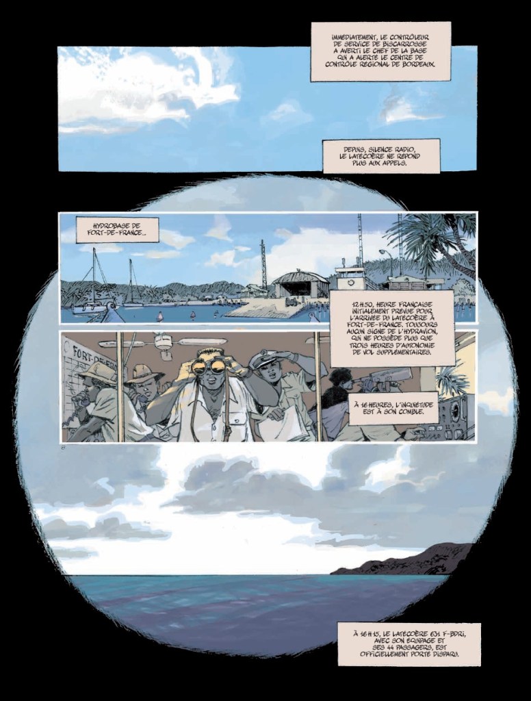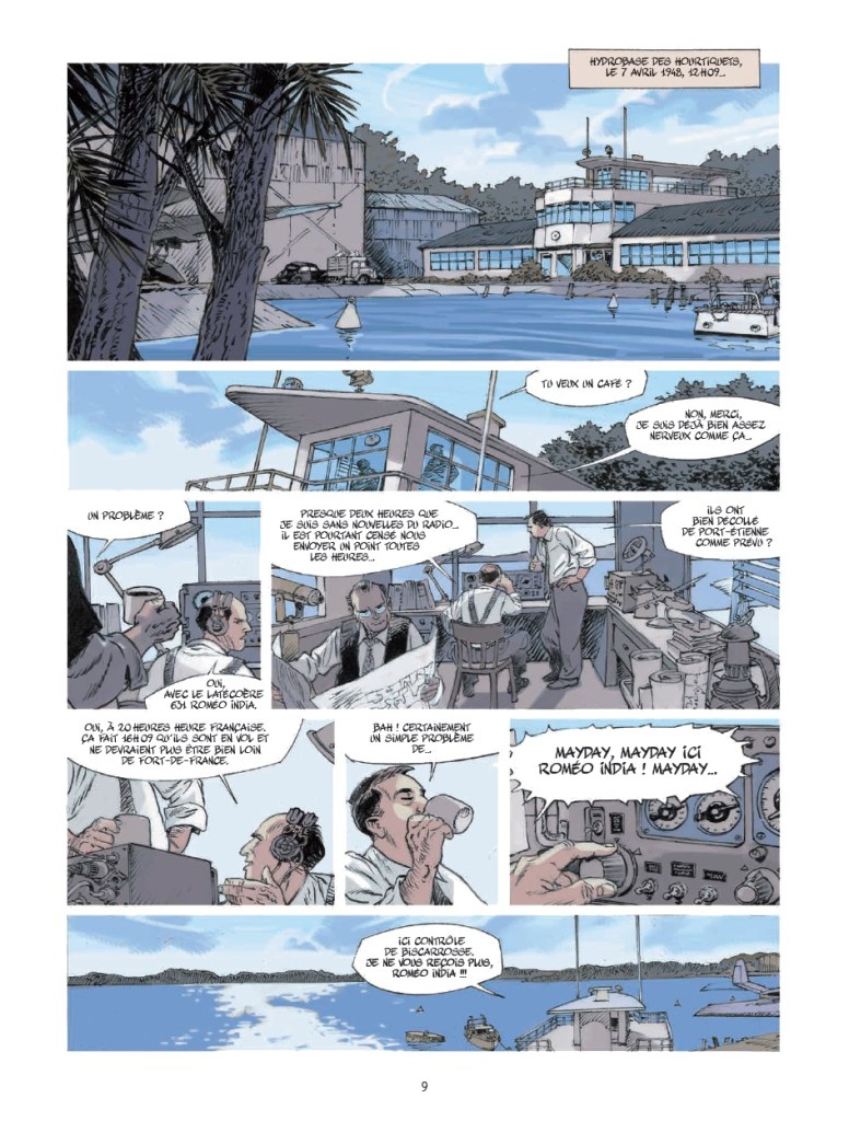 Ils ont gagné le gros lot : un voyage dépaysant au bout du monde et un 1er vol à bord du plus grand hydravion français: le Latécoère 631. Sauf qu’ils n’arriveront jamais à destination. Pas de spoiler, l’histoire de Jack Manini et Michel Chevereau le dit, le montre, dès les premières planches. L’intrigue n’est pas là. Commence alors le compte à rebours pour comprendre ce qui a pu se passer, si les passagers (mal)chanceux sont toujours vivants quelque part (pas à Fort-de-France) et les raisons qui ont conduit trois vétérans de la seconde guerre mondiale à mettre sur pied cette grande opération philanthropique, hors-norme.