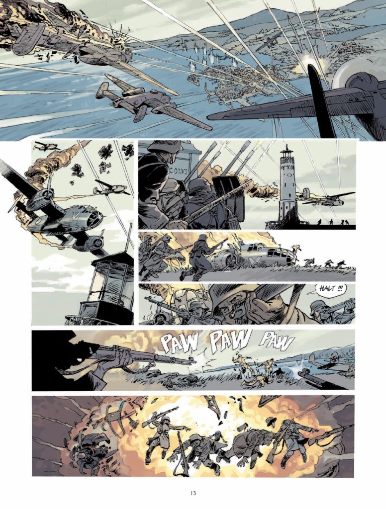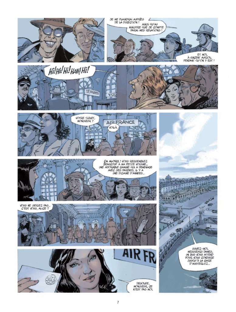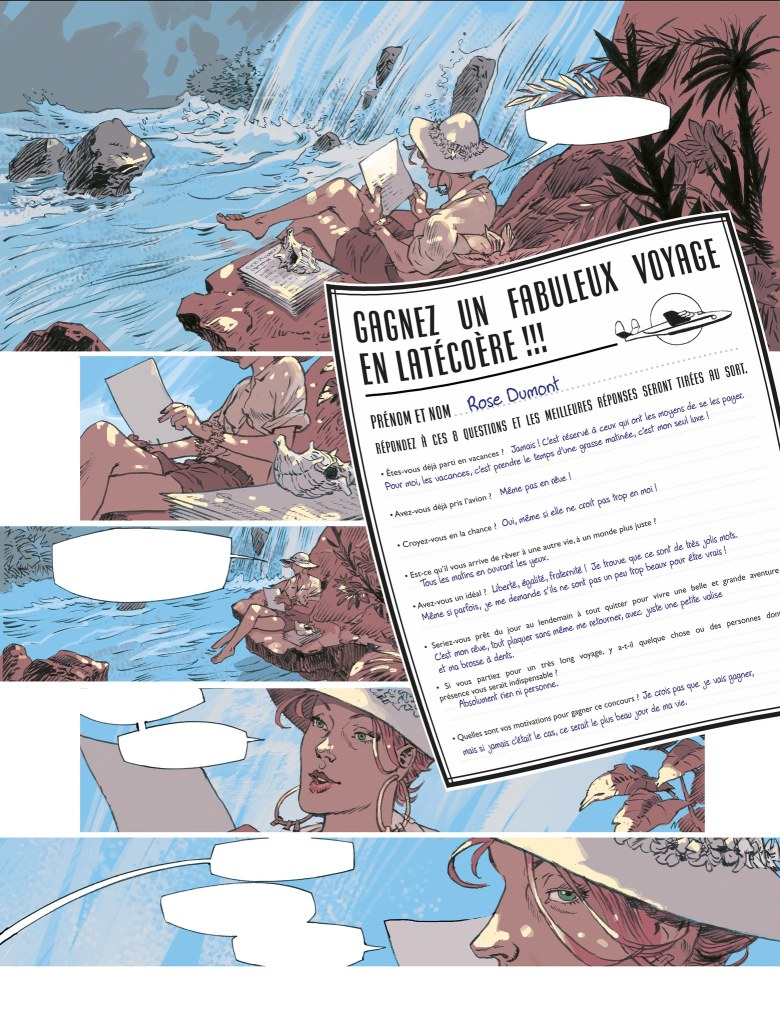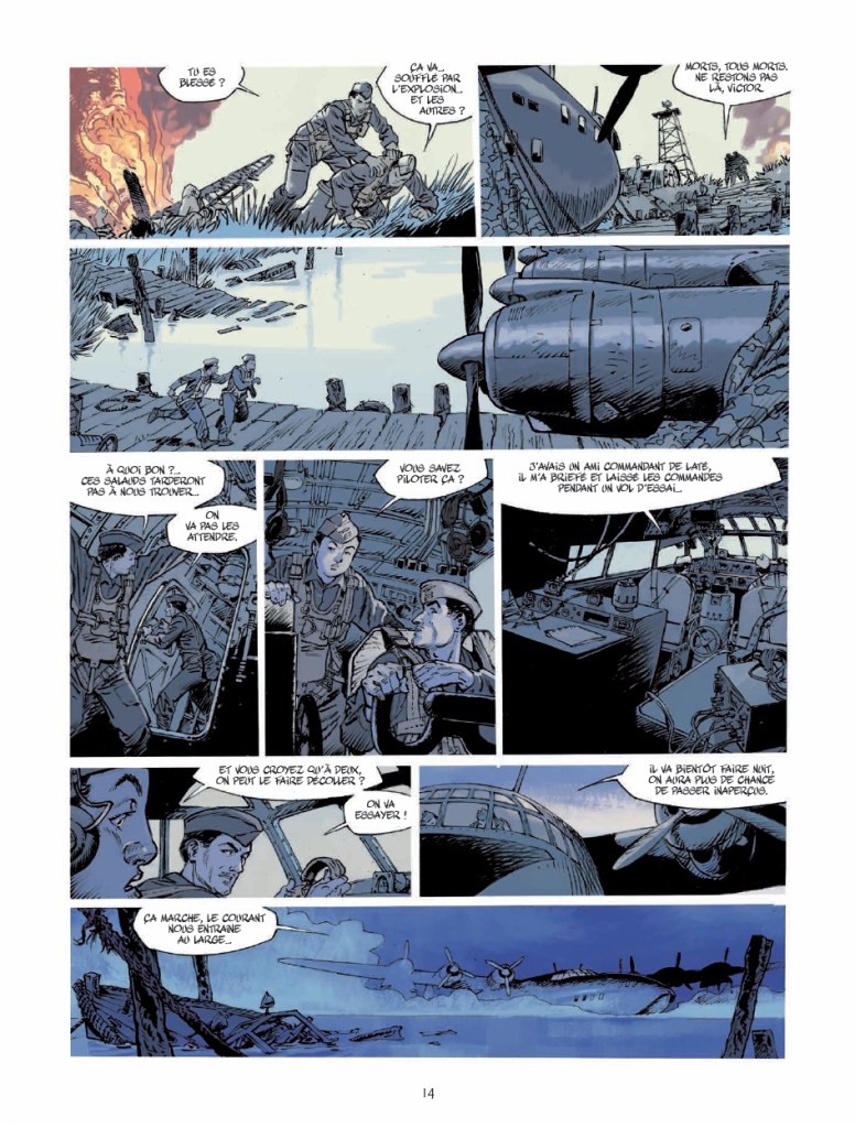 Ils ont gagné le gros lot : un voyage dépaysant au bout du monde et un 1er vol à bord du plus grand hydravion français: le Latécoère 631. Sauf qu’ils n’arriveront jamais à destination. Pas de spoiler, l’histoire de Jack Manini et Michel Chevereau le dit, le montre, dès les premières planches. L’intrigue n’est pas là. Commence alors le compte à rebours pour comprendre ce qui a pu se passer, si les passagers (mal)chanceux sont toujours vivants quelque part (pas à Fort-de-France) et les raisons qui ont conduit trois vétérans de la seconde guerre mondiale à mettre sur pied cette grande opération philanthropique, hors-norme.