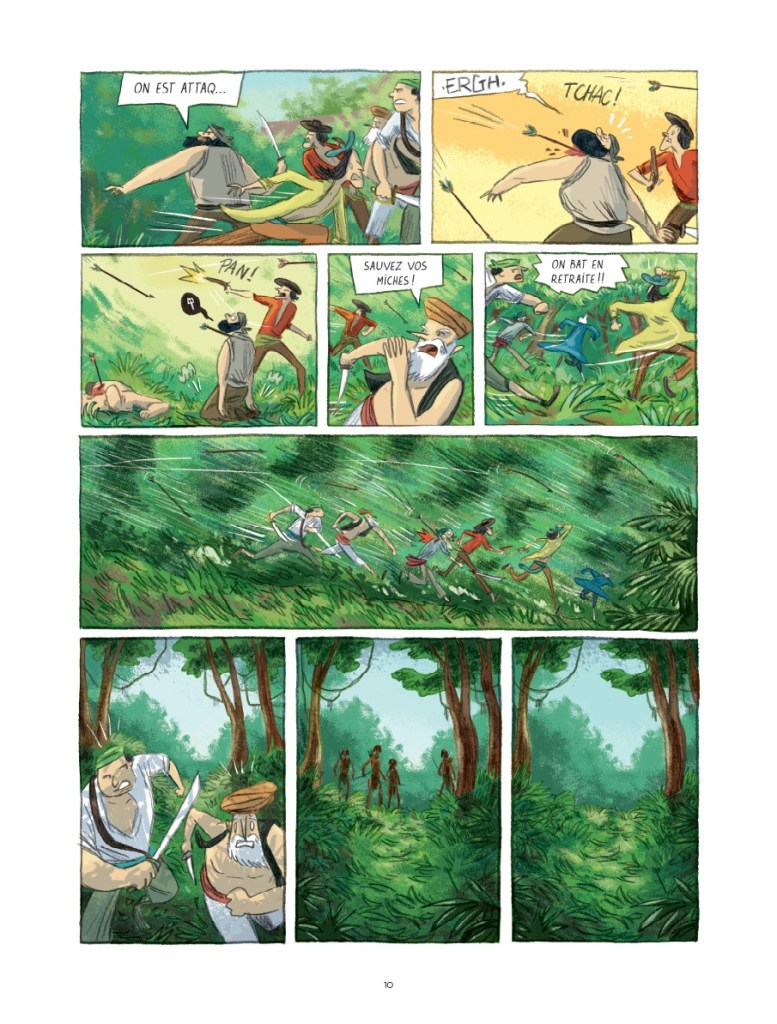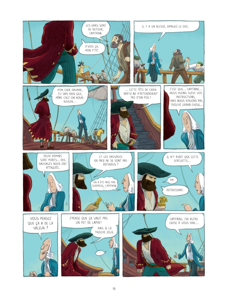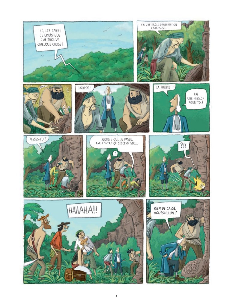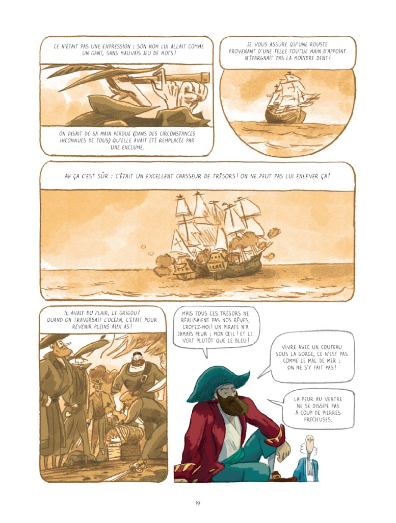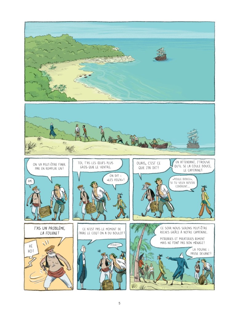 Farnos joue avec son lecteur, entre le vrai et le faux, les mystères et les légendes, dans l’affrontement de deux générations de capitaines adverses. Mais aussi avec ses personnages qui, tour à tour, prennent la lumière, éclairent le récit de leur vécu et de ce qu’ils pensent. Pendant 228 pages verbeux et riches en action, le natif de Béziers arrivé aujourd’hui à Poitiers, non loin de sacrées terres de corsaires, réussit un récit vibrant et tumultueux, haut en couleurs sans s’épargner la noirceur. Avec des allusions à un autre récit fondateur de la littérature française. De son dessin intrépide, dynamique, sérieux et hilarant à la fois, Rémi Farnos tape un grand coup et relance une chasse aux trésors à laquelle on ne croyait plus. Grandiose.