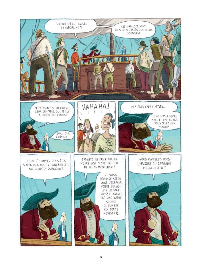 Emporté par la fougue de ces illustres personnages qu’il crée de toute pièce, Rémi Farnos réussit plus loin que le bruit de la mer, des sauts de cachalot, des armes et des planchers qui craquent, une oeuvre magique et sonore. Au fil des planches, il propose une collection de chansons qui rythment assez bien cet album par moments comédie musicale. Nous voilà complètement ailleurs dès les premières planches, mousses raillés par les collègues qui ont de la bouteille et craignant la prochaine arrivée tempétueuse du capitaine pour prononcer son discours motivant.