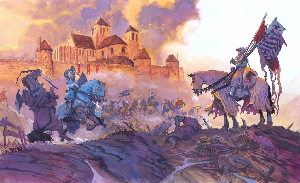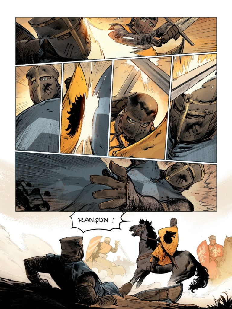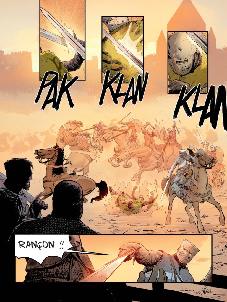 Avec cette nouvelle série, Brugeas et Toulhoat tranchent un peu avec leurs précédentes histoires. Si les scènes d’action sont toujours à sensations fortes, cinglantes (Toulhoat n’a pas son pareil pour découper les combats, les rythmer, en déformant les mouvements et les corps, en amenant de la vitesse, des détails, des dézooms, une variété d’angles de vue qui font mouche), cette fois, les auteurs évitent le bain de sang constant. Si les chevaliers s’affrontent pas pour du beurre – ost pour ost, dent pour dent – ce n’est pas Gladiator, le combat ne dure pas jusqu’à ce que mort s’ensuive mais que le battu se résolve à payer une rançon (à moins que la conspiration ne pousse le vice à se servir d’une joute pour assassiner quelqu’un, mais n’importe quel combattant ne peut pas se le permettre). À la fin du premier tome, si j’ai bien compté, il n’y avait pas encore de mort. Plutôt un exploit quand on connaît le pedigree des deux amis conteurs. Et celui du coloriste qui claque Yoann Guillo (rah, ces scènes éclairées à la torche, ces combats au lever du jour…).