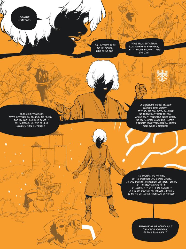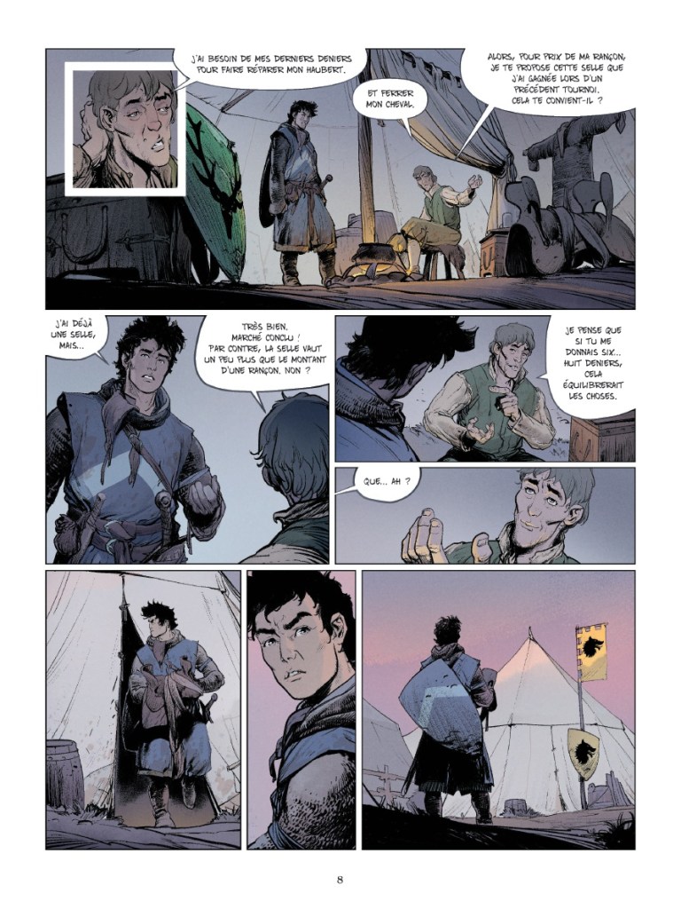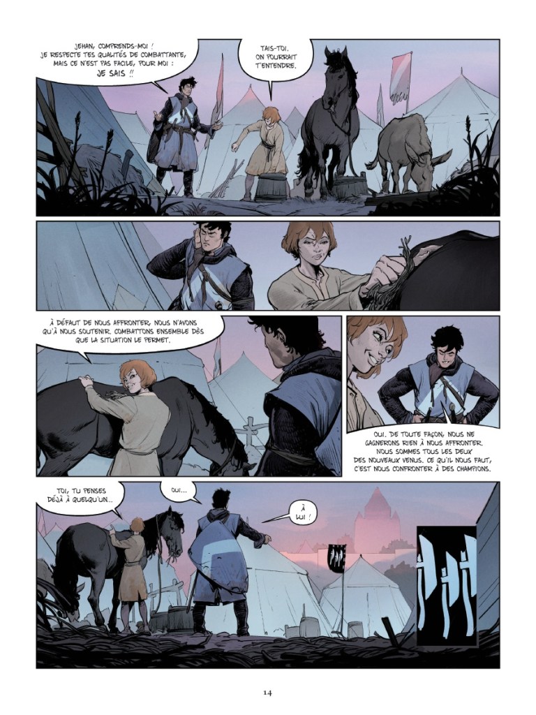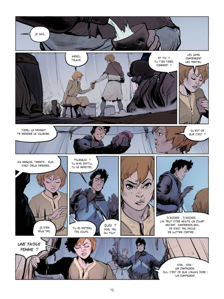Pas besoin de ça pour nous tenir en haleine dans cette histoire où les ennemis changent en fonction des combats et des retournements de veste, dans une situation politique compliquée, vu les divergences entre le roi et certains seigneurs qui se rêvent califes à la place du calife. Dans une unité de lieu, chaque jour étant un recommencement dans la poussière et le crottin, les deux auteurs créent un trio (Tête de Chien, alias Jehan et son secret, Chevron d’Argent, l’idéaliste Josselin, et Paulin, l’écuyer de Jehan qui rêve comme elle de changer de classe mais est fidèle à sa maîtresse), bientôt quintet. De forts tempéraments qui s’entrechoquent, chacun avec ses secrets et les raisons qui le poussent à prendre le haubert et l’épée. Pas que pour l’argent à tout prix (mais quand même un peu, pour passer une nuit au sec et l’estomac rempli). Et quand il y a une femme dans l’armure, elle risque gros!