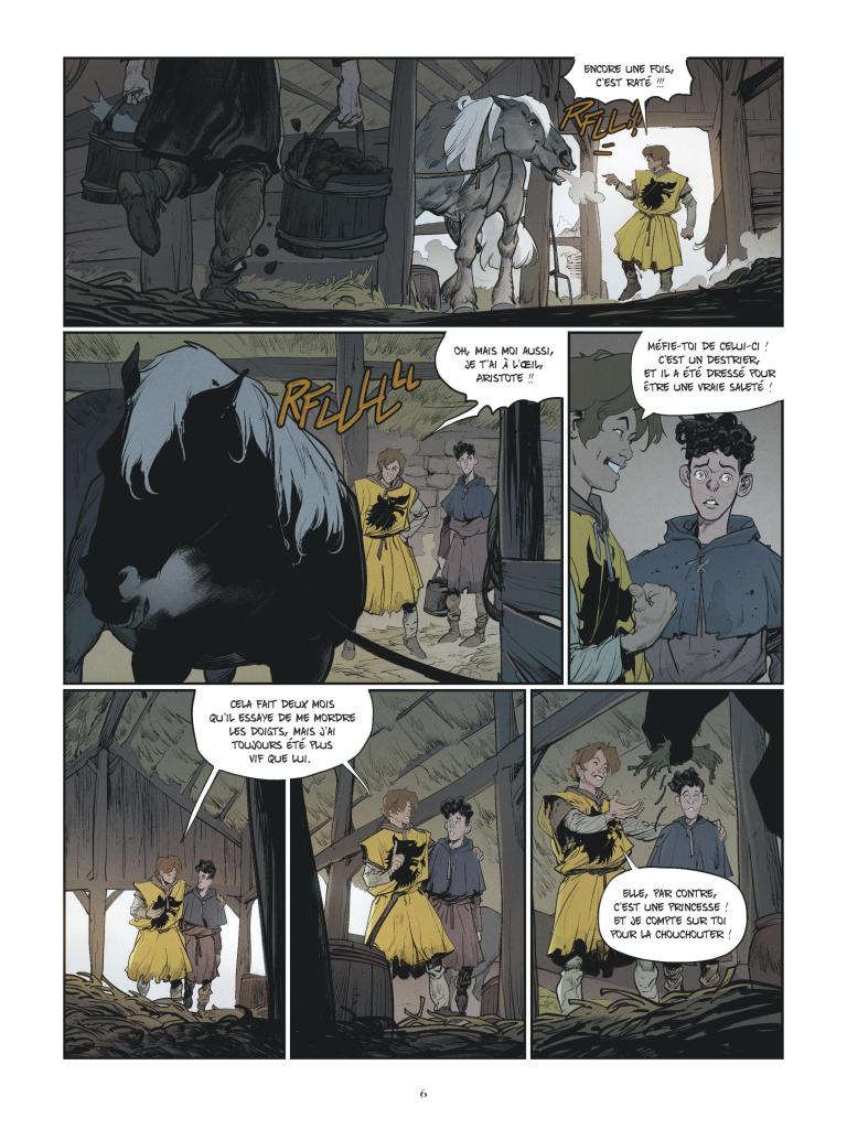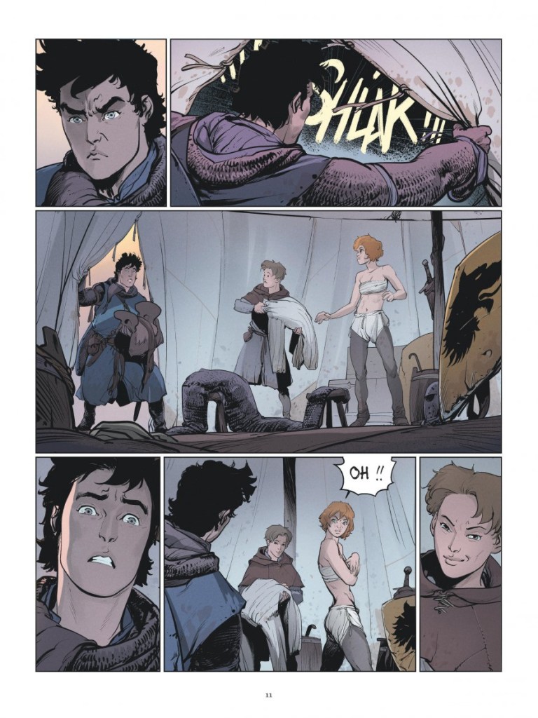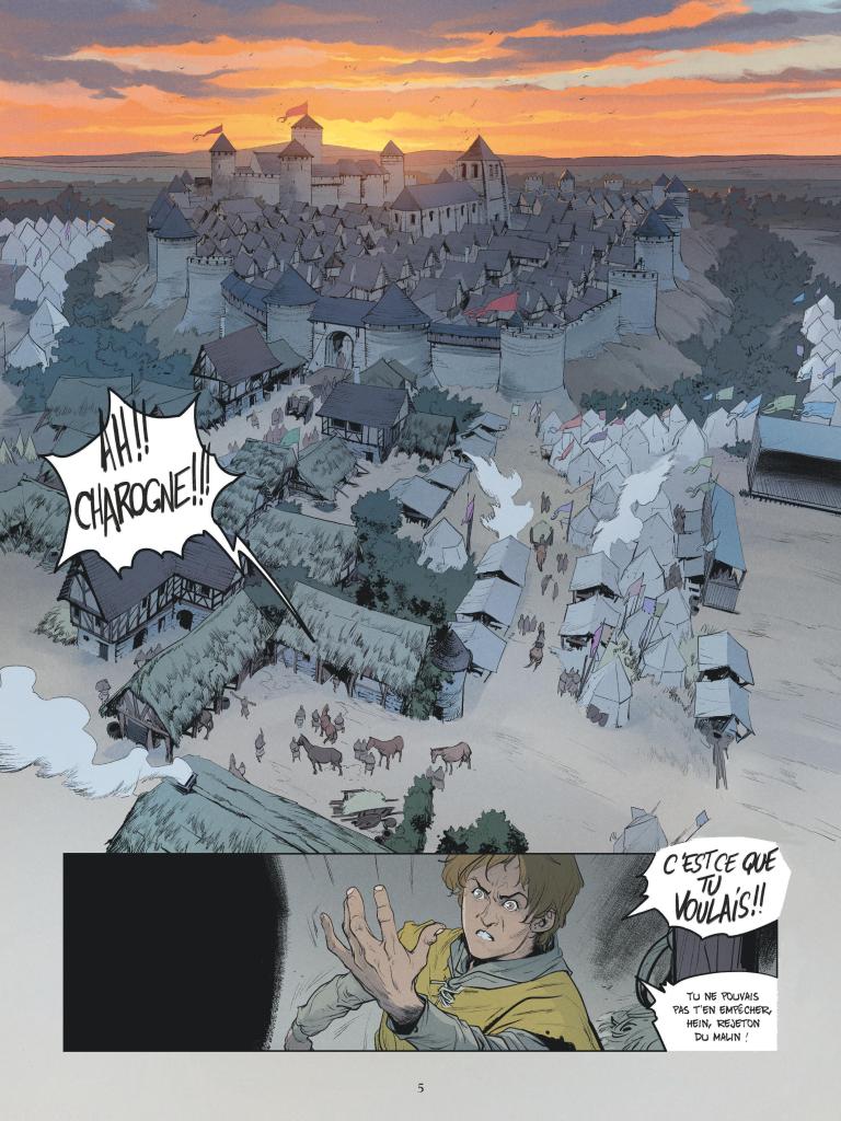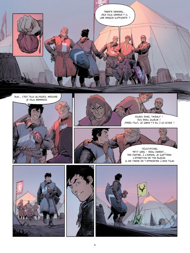 Pas besoin de ça pour nous tenir en haleine dans cette histoire où les ennemis changent en fonction des combats et des retournements de veste, dans une situation politique compliquée, vu les divergences entre le roi et certains seigneurs qui se rêvent califes à la place du calife. Dans une unité de lieu, chaque jour étant un recommencement dans la poussière et le crottin, les deux auteurs créent un trio (Tête de Chien, alias Jehan et son secret, Chevron d’Argent, l’idéaliste Josselin, et Paulin, l’écuyer de Jehan qui rêve comme elle de changer de classe mais est fidèle à sa maîtresse), bientôt quintet. De forts tempéraments qui s’entrechoquent, chacun avec ses secrets et les raisons qui le poussent à prendre le haubert et l’épée. Pas que pour l’argent à tout prix (mais quand même un peu, pour passer une nuit au sec et l’estomac rempli). Et quand il y a une femme dans l’armure, elle risque gros!