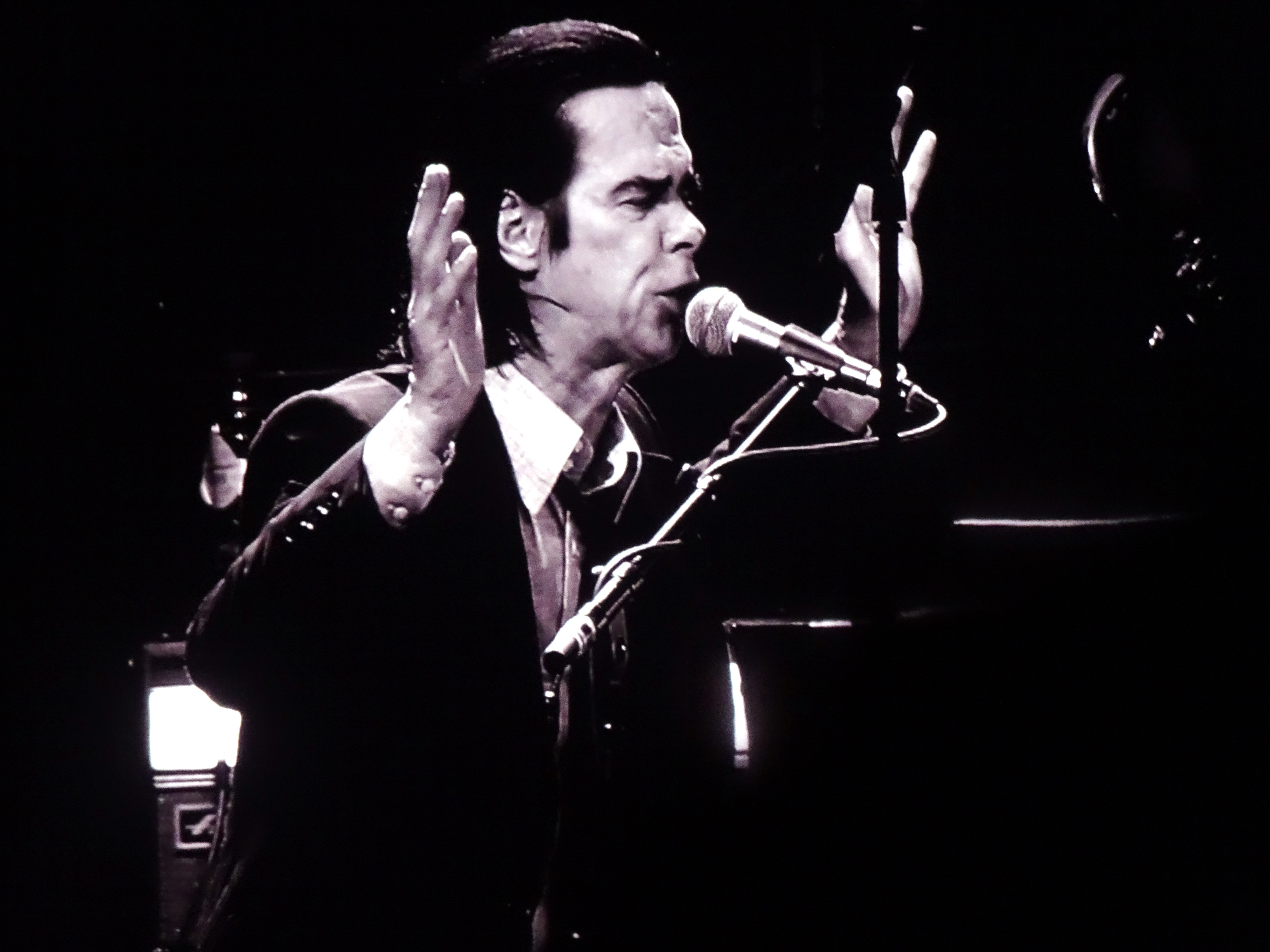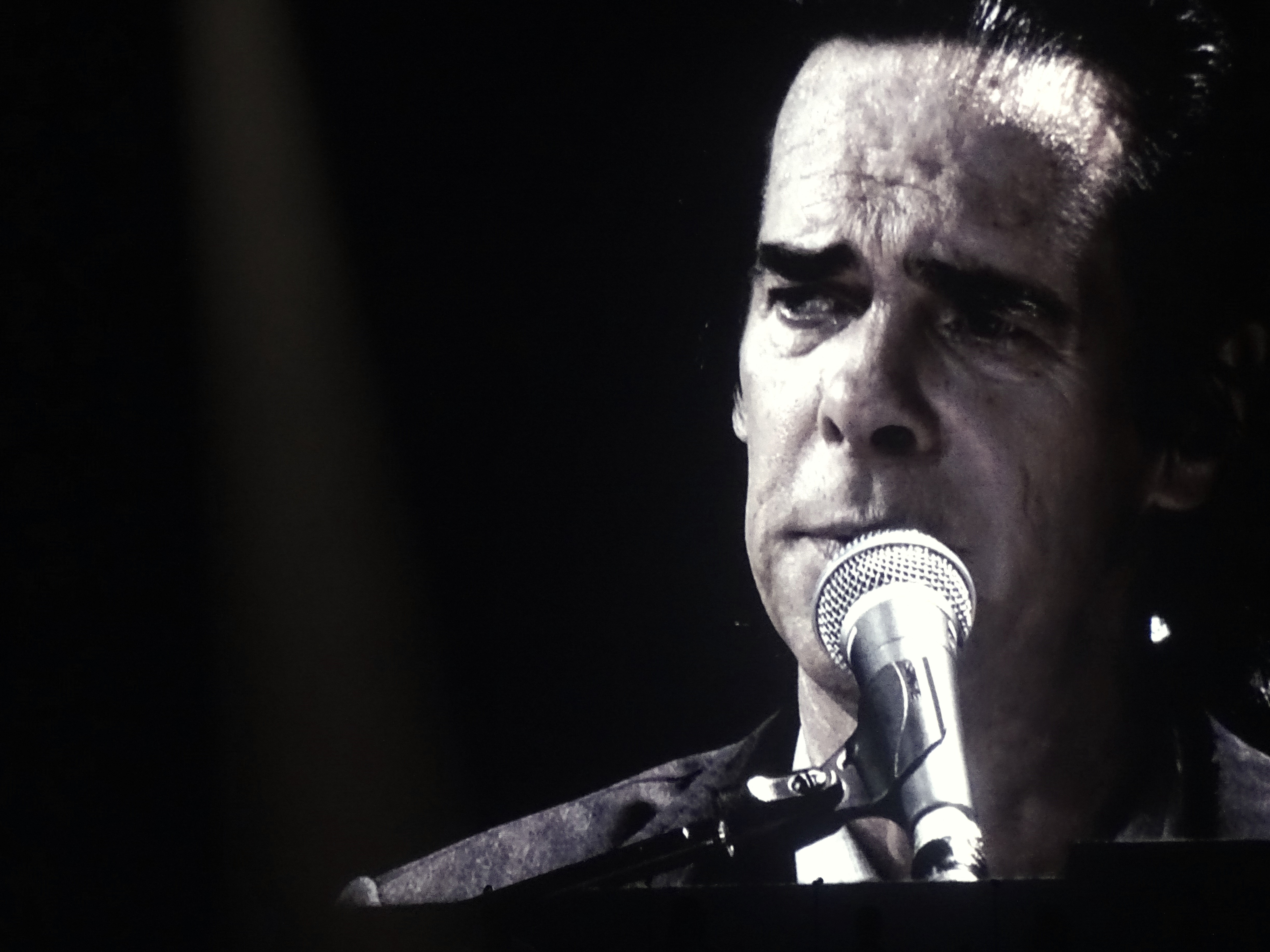Je ferai des photos brutes, en noir et blanc, imparfaites certes et retravaillées ensuite, juste pour tenter de vous faire partager mon ressenti, ce ressenti énorme qui habite chaque personne qui a la chance d’assister à un spectacle de Nick Cave et de ses inimitables Bad Seeds.