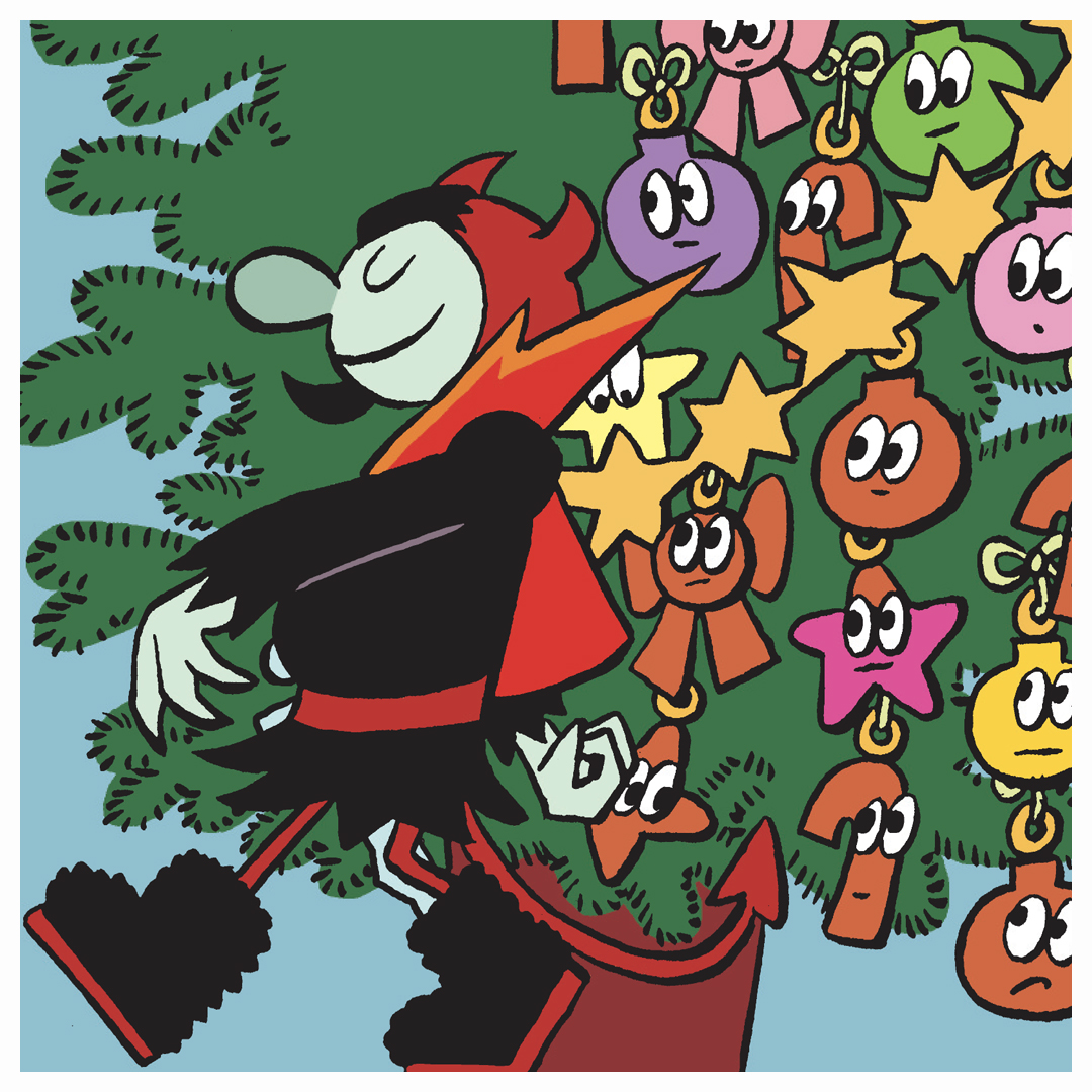 Ah, y’a pas à dire, ce démon maniaque s’applique pour que son arbre brille de mille feux. Mais pour y parvenir, il a dû attraper étoiles, sucres d’orge et autres nœuds comme autant de Pokémon, qu’il a enfermés dans une cage avant de les ligoter aux branches de son conifère.