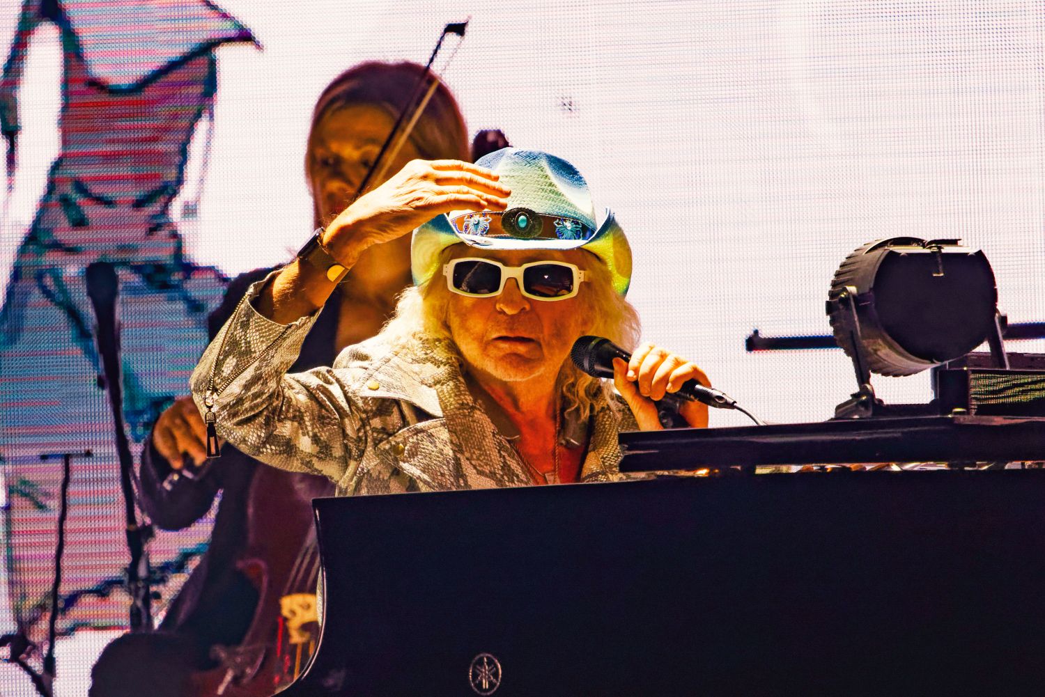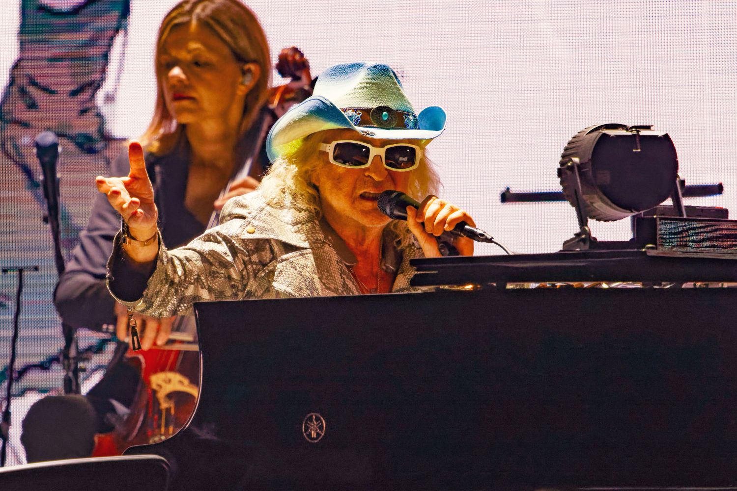 Cette fois même si on sait l’artiste diminué par les gros problèmes de santé qui ont failli lui coûter la vie, il nous est apparu plus en forme et a proposé un show, court il est vrai, mais magnifiquement mis en scène, allant à l’essentiel avec un plaisir visible d’être sur scène dans une ville qu’il aime beaucoup.