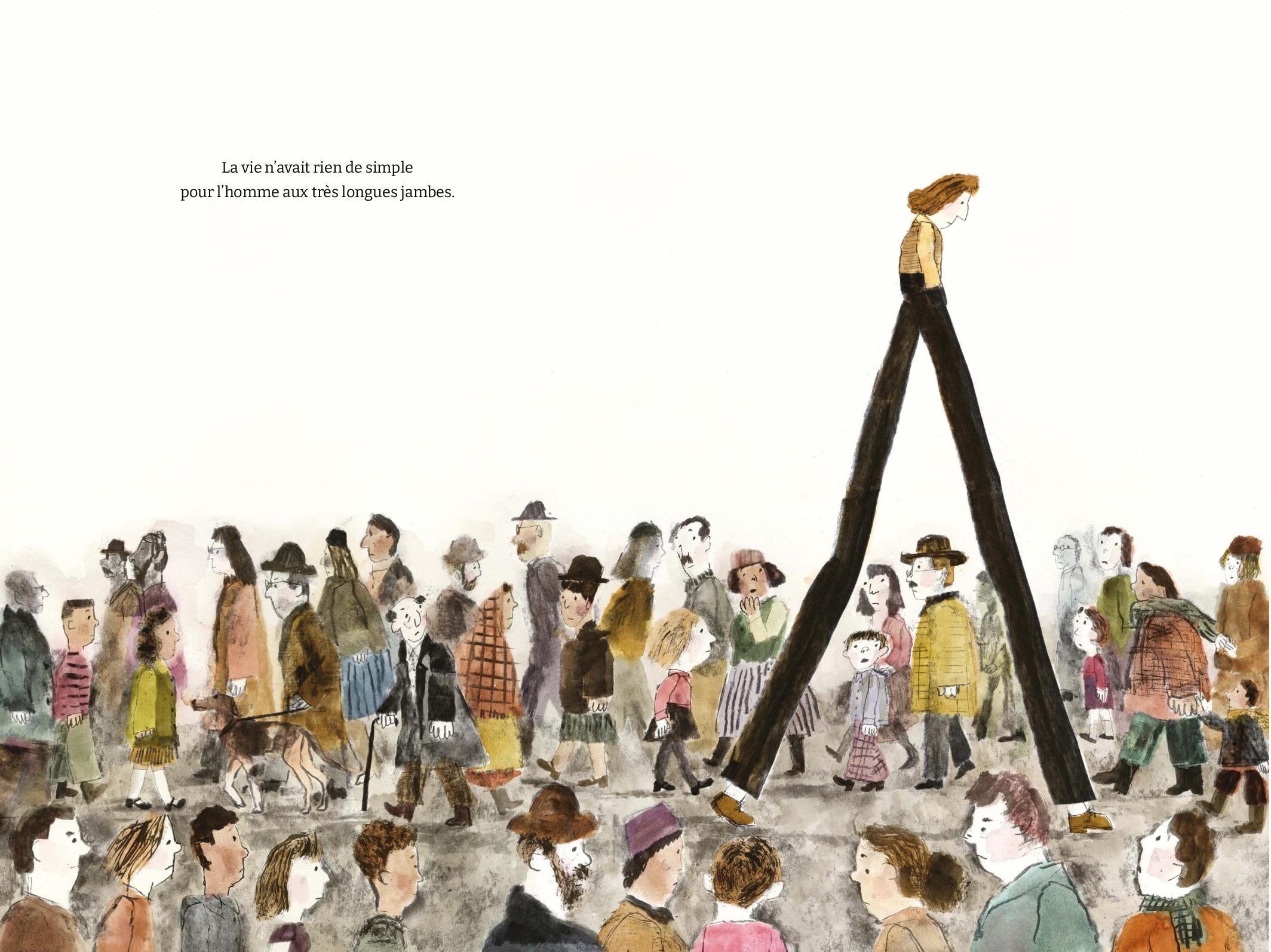 Résumé de L’homme aux très longues jambes par Albin Michel Jeunesse : La vie n’est pas simple pour l’homme aux très longues jambes. Rien n’est à sa taille et les autres se moquent de lui. Le jour où un gigantesque orage s’abat sur la ville, il se met à aider tous les habitants qui n’en avaient que faire de lui jusque-là… Tous, sauf un : Carlos l’avait remarqué depuis longtemps, lui.