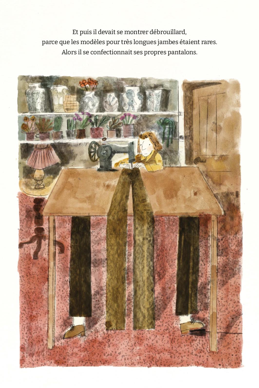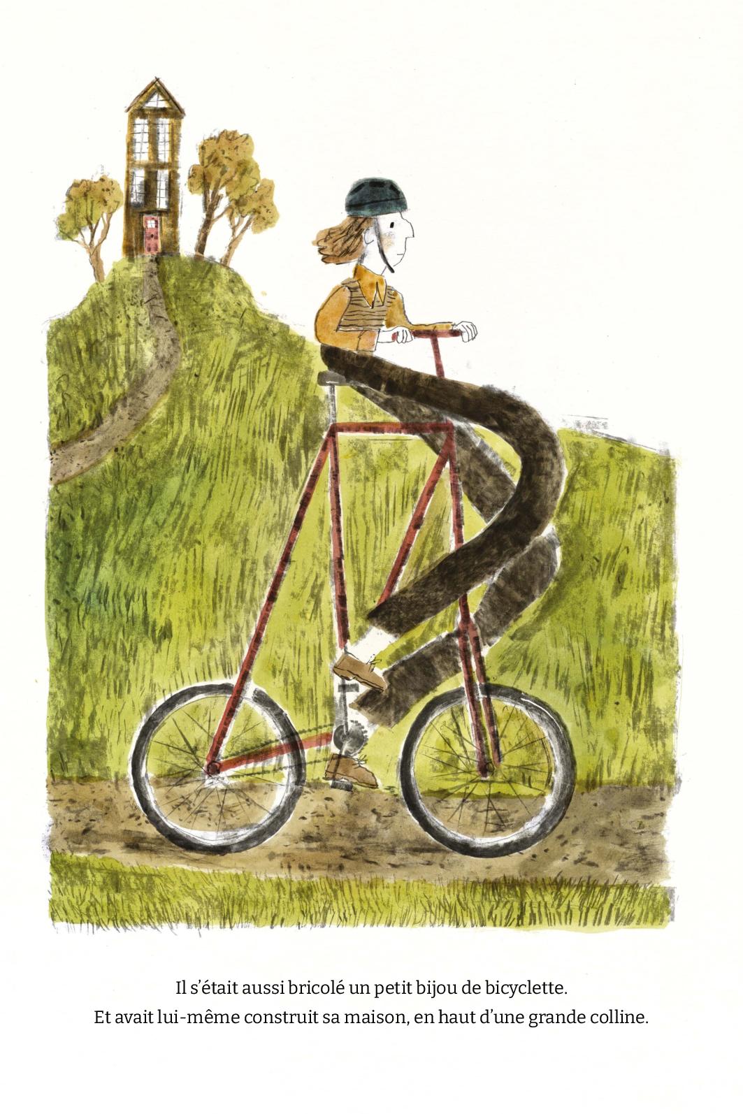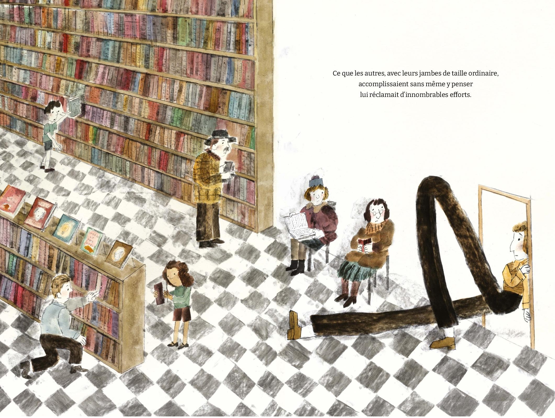 Au-delà de sa maison et de son vélo sur-mesure, L’Homme aux très longues jambes doit sans cesse s’adapter au monde de ses semblables minuscules. On ne vous dit pas les contorsions qu’il doit faire pour entrer au supermarché ou dans le métro. Il doit sans cesse se plier dans tous les sens, alors que les habitants de sa ville, eux, ne font pas d’effort, bien au contraire, pour lui faire une place. On se moque de lui, on ne l’aide pas. L’homme aux très longues jambes est bien seul. Heureusement, il a ses oiseaux dont il s’occupe avec amour et bienveillance et qui le lui rendent bien. Ce sont bien les seuls, et peut-être le patron timide de ce magasin de bricolage.