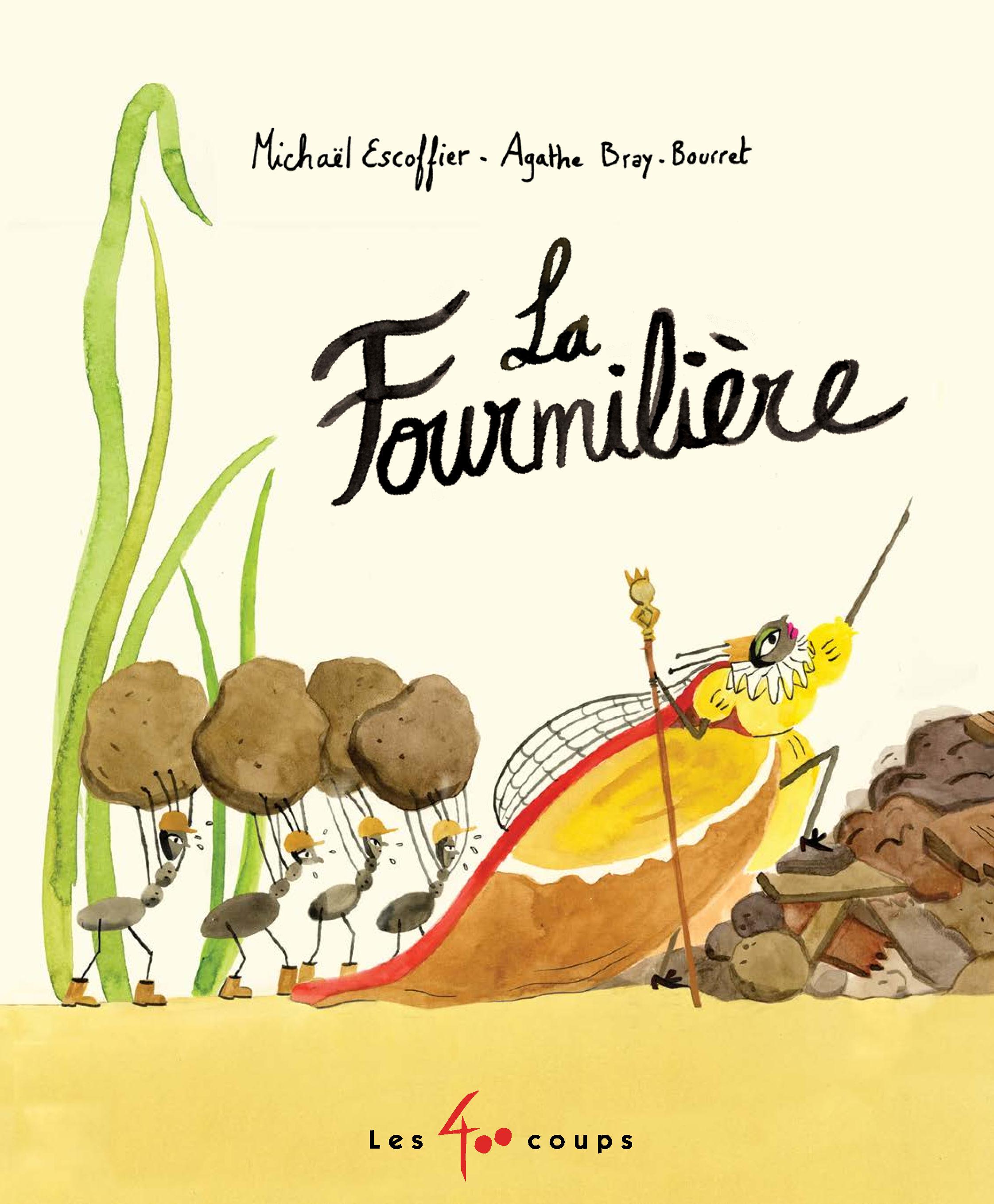 C’est un peu trash dit comme ça, mais Michaël Escoffier a le talent de mettre quelques terreurs actuelles du monde des grands (l’esclavage, la dictature, les inégalités, l’aveuglement et l’égoïsme qui mènent un peuple à sa perte, un boulot trop omniprésent qui prend le pas sur la qualité de vie, le deuil, le rôle de l’Homme qui menace son environnement…) à portée des petits. Gloire aux fourmis? Avec une reine-mère grattinée, des fourmis majordomes, soldates, bouffonnes et surtout ouvrières, Agathe Bray-Bourret met ce petit monde menacé en scène, avec générosité, humour mais aussi émotion. La balance entre les deux est bonne, jusqu’au clou du spectacle, éléphantesque, à la dernière page qui nous offre un sacré retournement de situation hilarant. Ma petite s’est bien amusée avec ce livre.