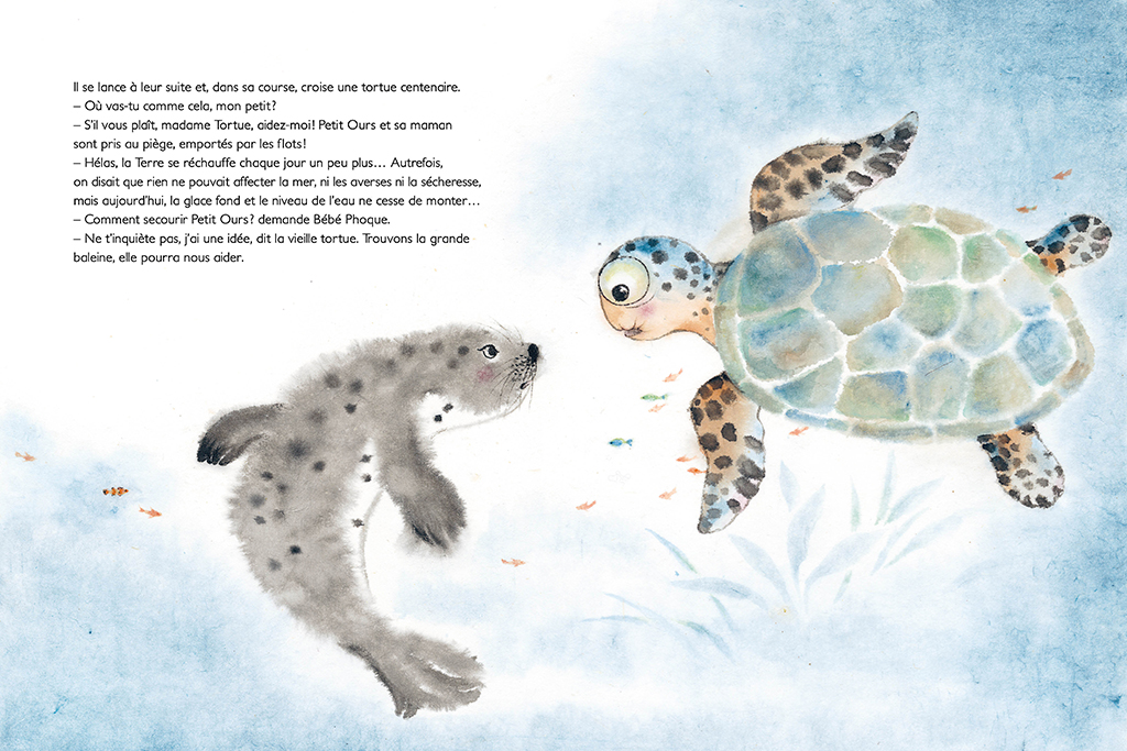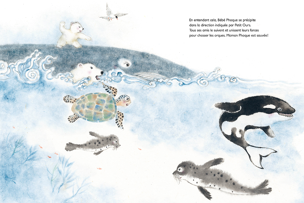 Dans cet univers blanc, froid et impitoyable, la conteuse chinoise He Zhihong signe pourtant un album à hauteur des plus petits. Avec ses aquarelles moutonneuses, qui rendent les animaux un peu plus vivants, et des techniques diversifiées pour, par exemple, matérialiser l’eau très calligraphiée, l’illustratrice nous entraîne au large, dépaysant, à la rencontre de la faune glaciaire avec beaucoup de poésie et de mignonnerie, sans pour autant édulcorer la cruauté dont est capable le monde sauvage.