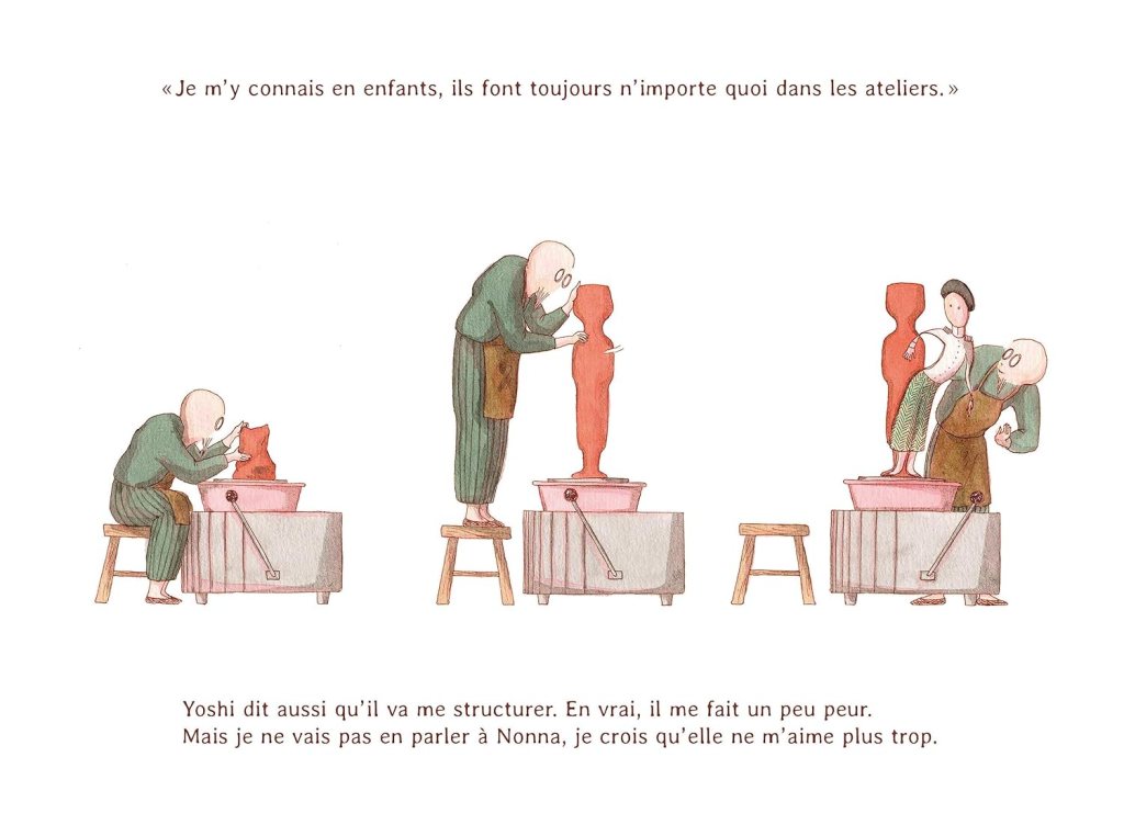 J’ai beaucoup aimé l’esthétique de ce livre, qui anime des personnages très simples et universels (à la Tintin ou Bécassine) dans des décors détaillés, qui nous projettent et nous apprennent plein de choses sur les métiers de céramiste ou de graveuse. Dans le fond comme la forme, la curiosité est suscitée. Avec, en prime, une recette en fin d’album pour mettre la main à la pâte à papier.