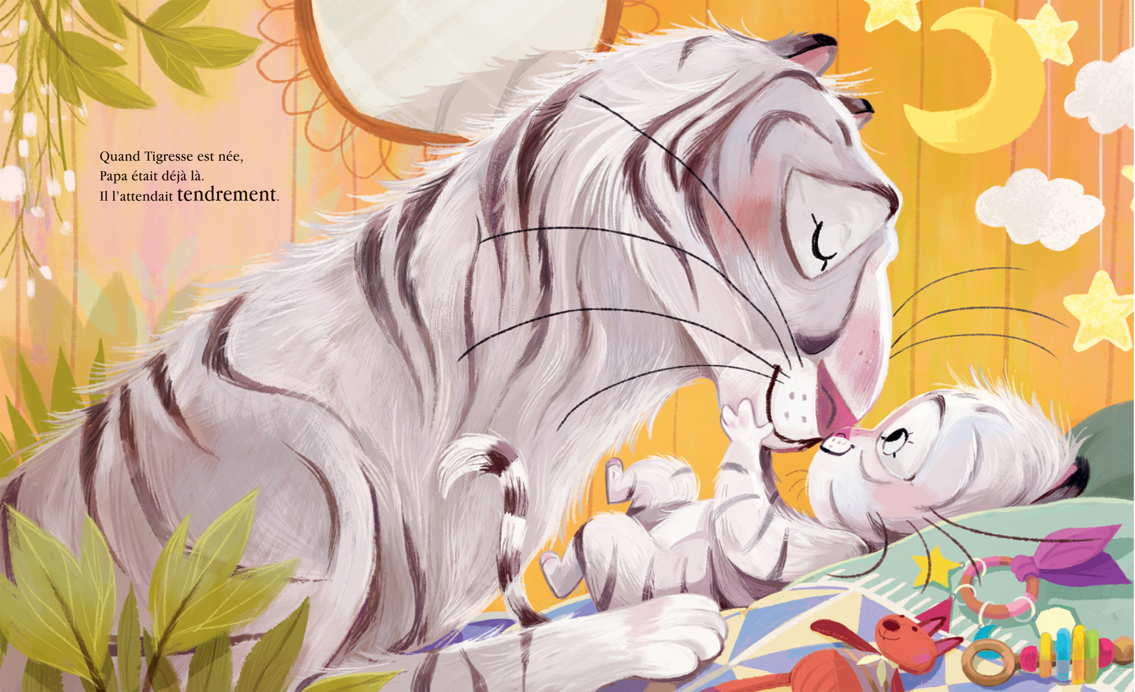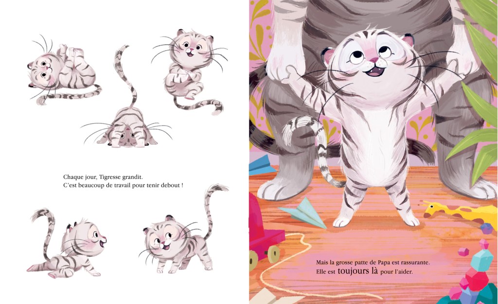 Mais pour arriver à se hisser dessus, Tigresse va devoir faire beaucoup d’effort et de roulés-boulés. Heureusement, si elle s’emmêle les pinceaux, papa est là pour l’aider à mettre une patte devant l’autre, et ainsi de suite.