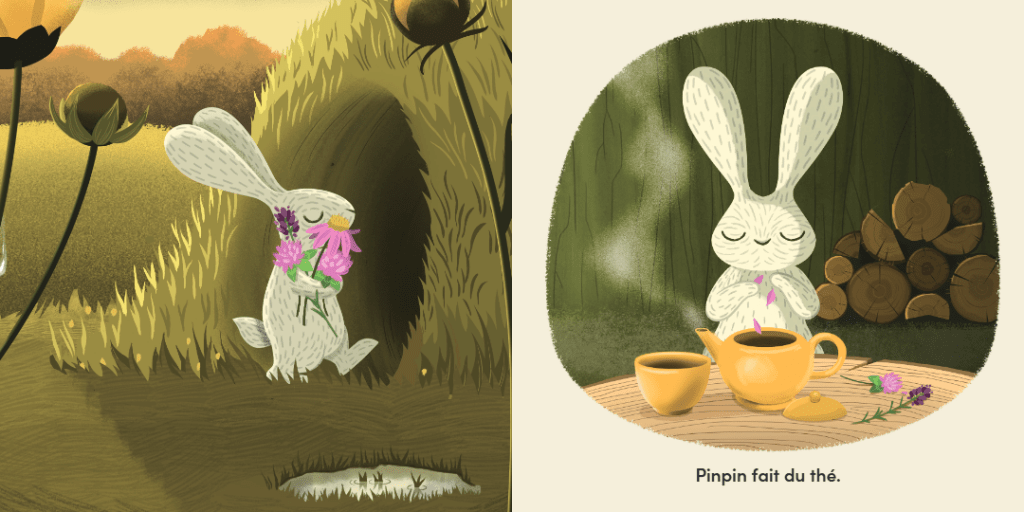 Par monts et par vaux, Pinpin, le lapin blanc, avait réuni les fleurs sauvages utiles à une bonne infusion, bien méritée. Mais, pour le repos du cueilleur, on repassera. Voilà qu’une oppossum, Didel, surgit dans le terrier. Pinpin est trop bon, il la laisse boire jusqu’à la dernière goutte ce qu’il convoitait. Heureusement, dans la nature, les ingrédients et l’eau sont illimités. Embêté mais pas découragé, Pinpin repart à la cueillette et rebelote, Didel a cette fois passé le mot à ses rejetons qui eux aussi veulent boire la potion magique.