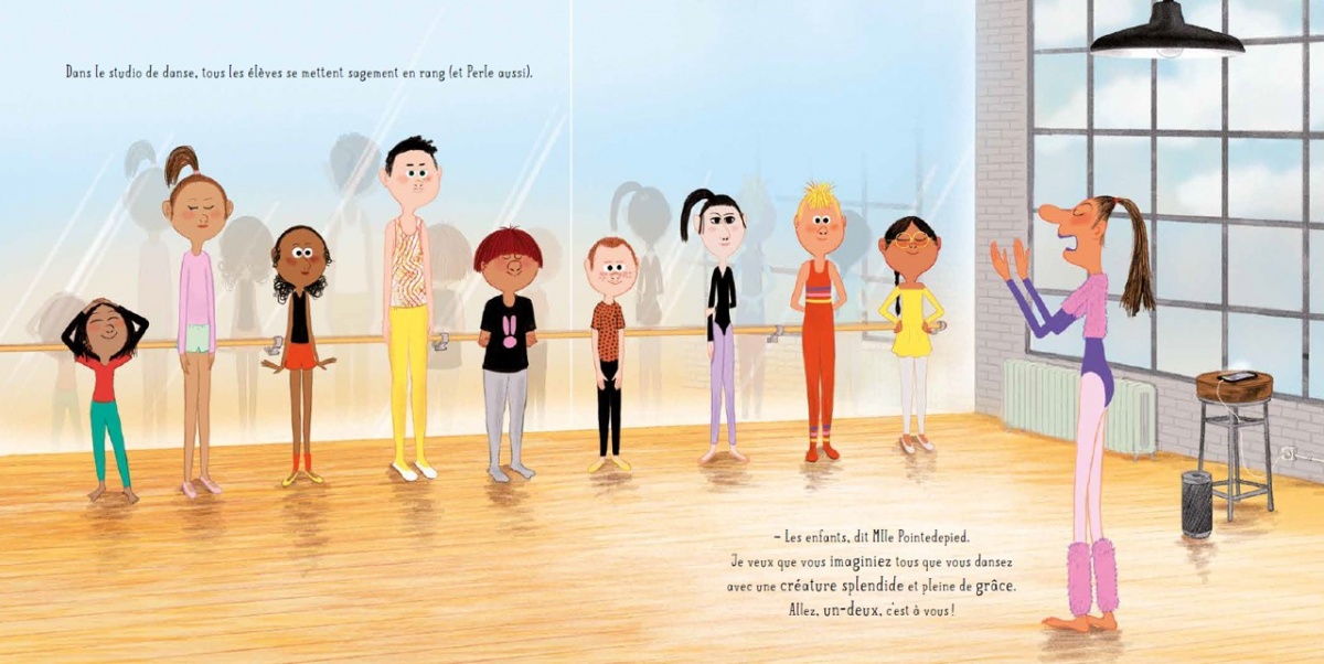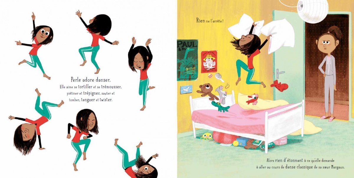Dansez comme vous voulez! Ah bon? Dès le lever du lit, au déjeuner, sur le chemin de l’école, partout, tout le temps, Perle ne marche pas, elle saute, elle danse, elle est faite pour ça. Son enthousiasme débordant conduit donc ses parents à l’inscrire à des cours de danse classique. Mais Perle n’est pas classique!