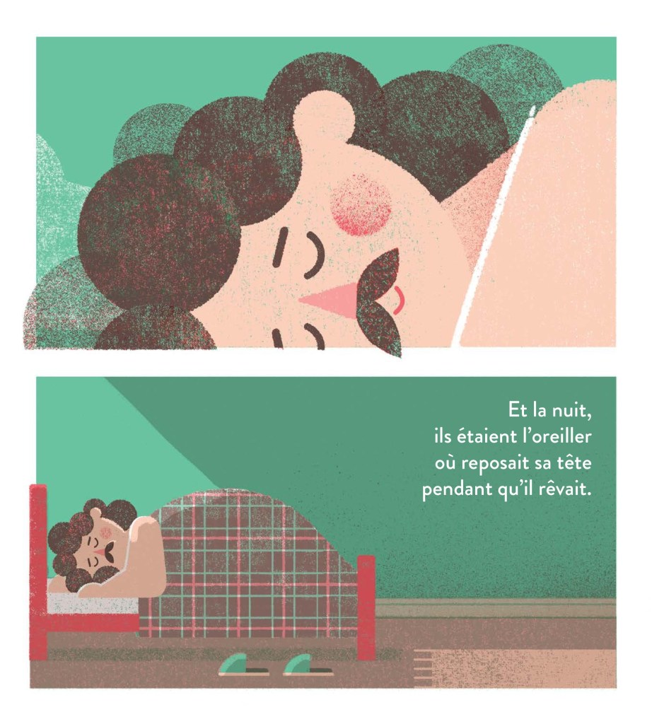 Dans cet album multicolore, qui fait contre mauvaise fortune coiffeur, euh… bon coeur, Cécilia Ruiz (traduite par Marie-Andrée Dufresne) prend son temps pour déployer, défriser son histoire, avec 56 pages d’images aux tons et teintes doux, passant de la tristesse à non pas la résignation mais l’acceptation, le lâcher-prise, l’acceptation de soi. Et ça, c’est un boulot de tous les jours, parce que le temps court et notre apparence change. Caresse et réconfort.