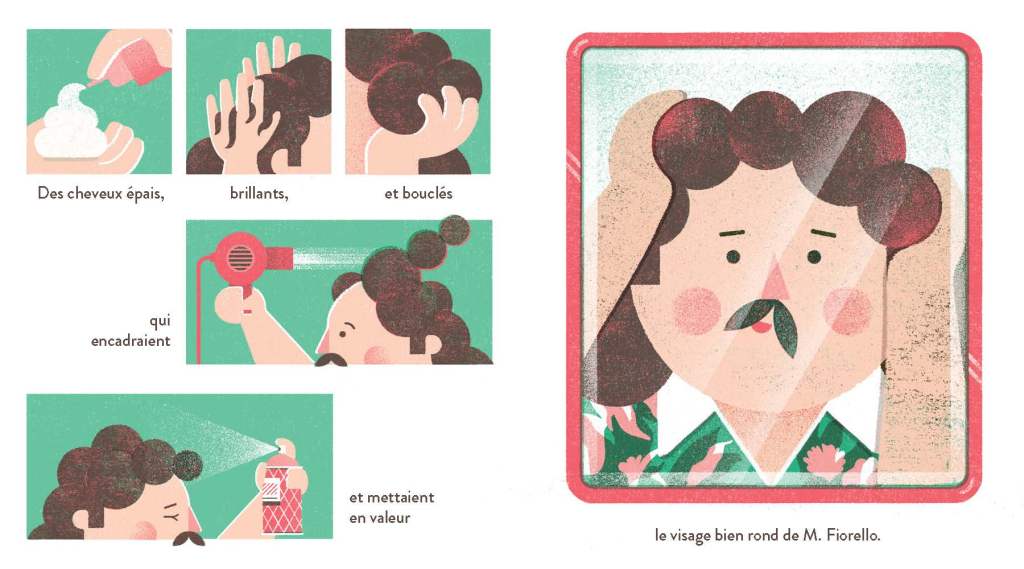 Cet album annoncé comme ludique et philosophique, il me laissait un peu circonspect. Je pensais que le thème allait passer par-dessus de la tête de ma bambine (bientôt 3 ans, donc sans doute encore un peu jeune pour cette lecture). Juste un balayage? Non, force est de constater qu’elle a accroché à cet album aux dessins et couleurs magnifiques, avec du grain, de la vie, du mouvement et finalement beaucoup de sérénité. Puis, quitte à voir les choses de manière positive, le temps que passait M. Fiorello à prendre soin de son cuir chevelu, il va pouvoir l’utiliser pour un autre passe-temps. Surprise en fin de livre!