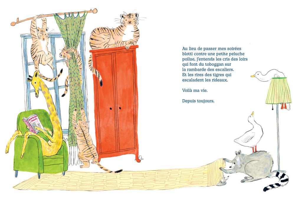 L’autrice-illustratrice israélienne Inbar Heller Algazi signe là un chouette album, très original, montrant ce que peut être l’envers d’un rêve complètement fou. Avec cette ménagerie, l’artiste a imaginé quelques situations folkloriques, énervantes pour le héros (et on le comprend) mais très amusantes pour le jeune lecteur/spectateur. Et, devinez quoi, coeur sur la patte, après une grosse colère, tout finit par s’arranger et redonne sa place à tout le monde. Même s’il faudra changer les rideaux, labourés par les tigres, et ramasser les crottes des ratons laveurs qui jouaient à cache-cache sous la carpette. On n’en a jamais fini. Allez, zoo, zou, au lit!