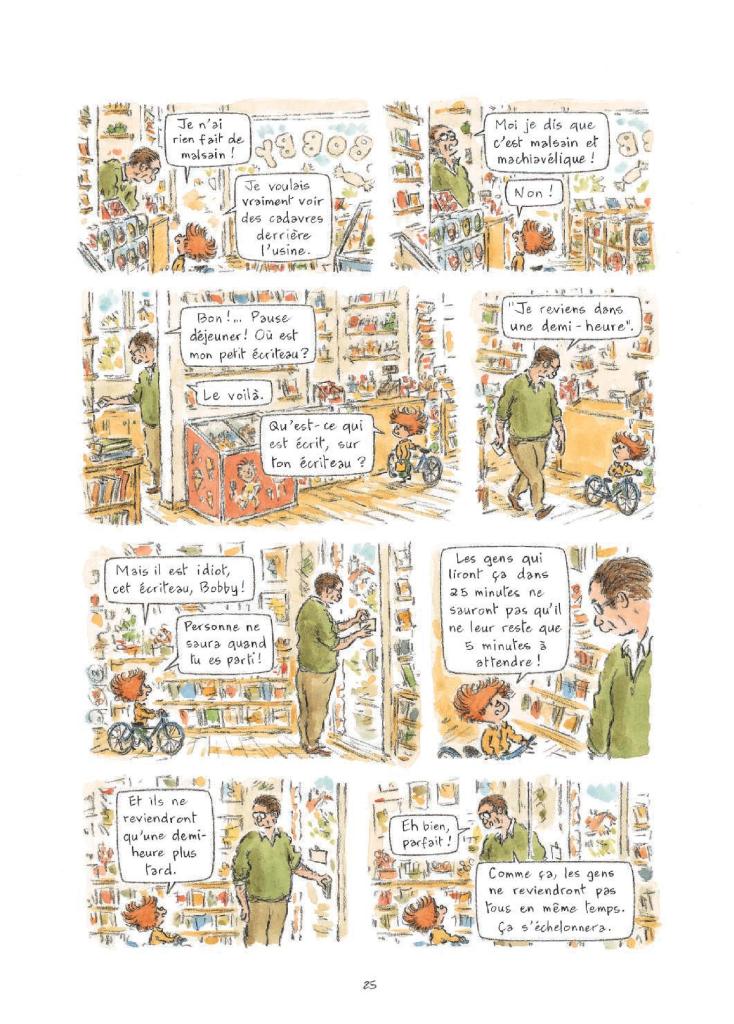 Ici, par exemple, Pico va tuzer (« réfléchir » en wallon) sur la signification d’une personne « sans histoires ». En l’occurrence, Ana Ana. Érudit pour son âge, Pico reste tout de même un enfant. S’il nous épate parfois par ses réflexions, ses bons mots, sa logique et son bon sens implacables, cette manière de remettre à leur place les plus grands et d’analyser des thématiques comme l’égalité homme-femme, Pico a aussi cette insouciance et cette désinvolture qui lui font aussi faire tout et n’importe quoi. Insaisissable et tellement saisissant Pico Bogue pour éclairer notre banal quotidien.